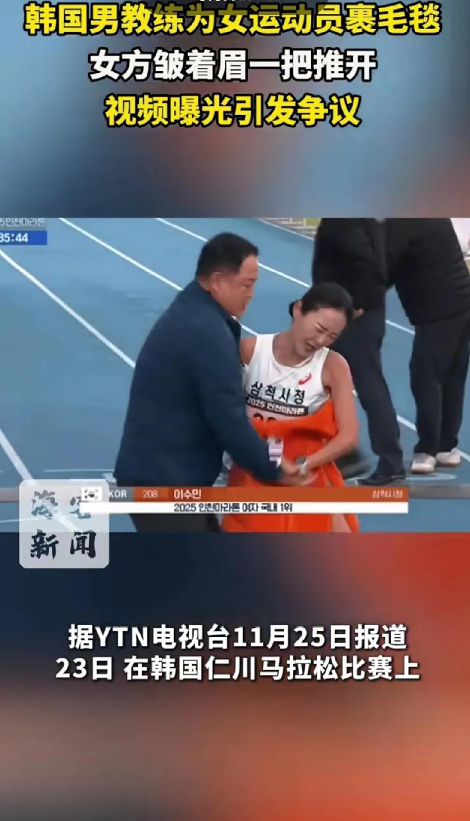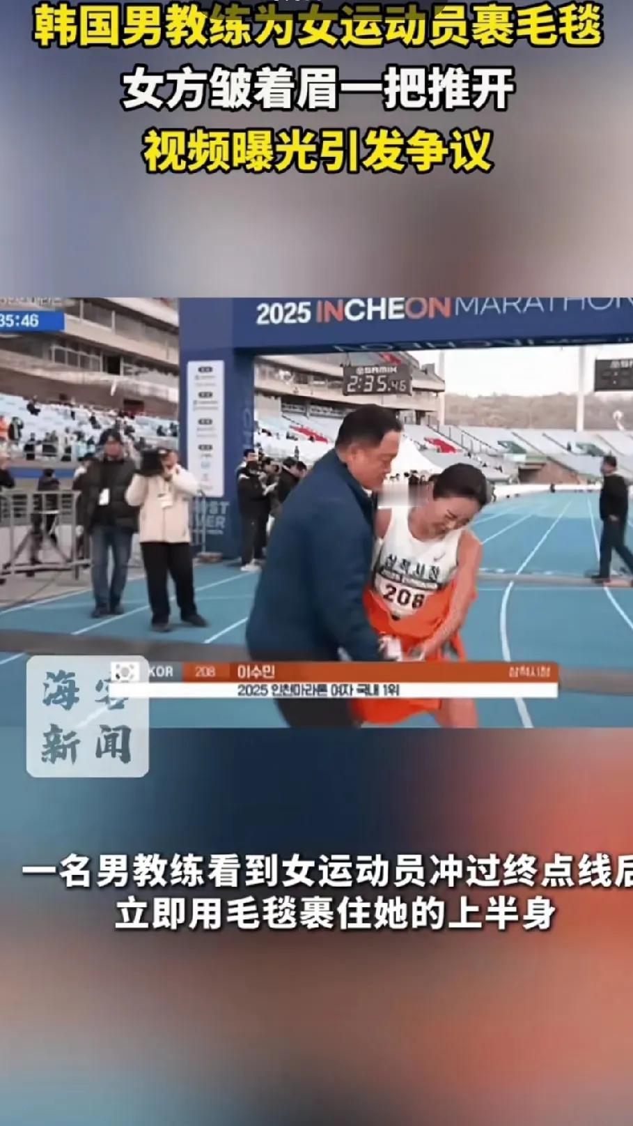 这个韩国男教练很奇怪的举动,女运动员在跑步,他拿一张红色围巾,强行给女运动员裹上。 女运动员皱眉挣脱,像极了俩口子吵架的行为举止。男人百般讨好,女人不耐烦的摆脱。