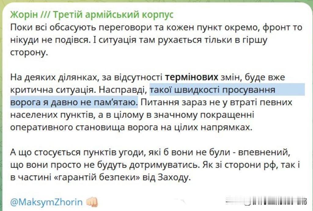 #俄乌冲突# 乌克兰新纳粹武装“亚速”第三突击军团成员在其TG频道承认: 俄罗斯人在整个战线上都在快速推进,前线乌军的处境非常糟糕。 #乌克兰男子遭强制征兵当场自爆##俄罗斯回应28点新计划变19点#