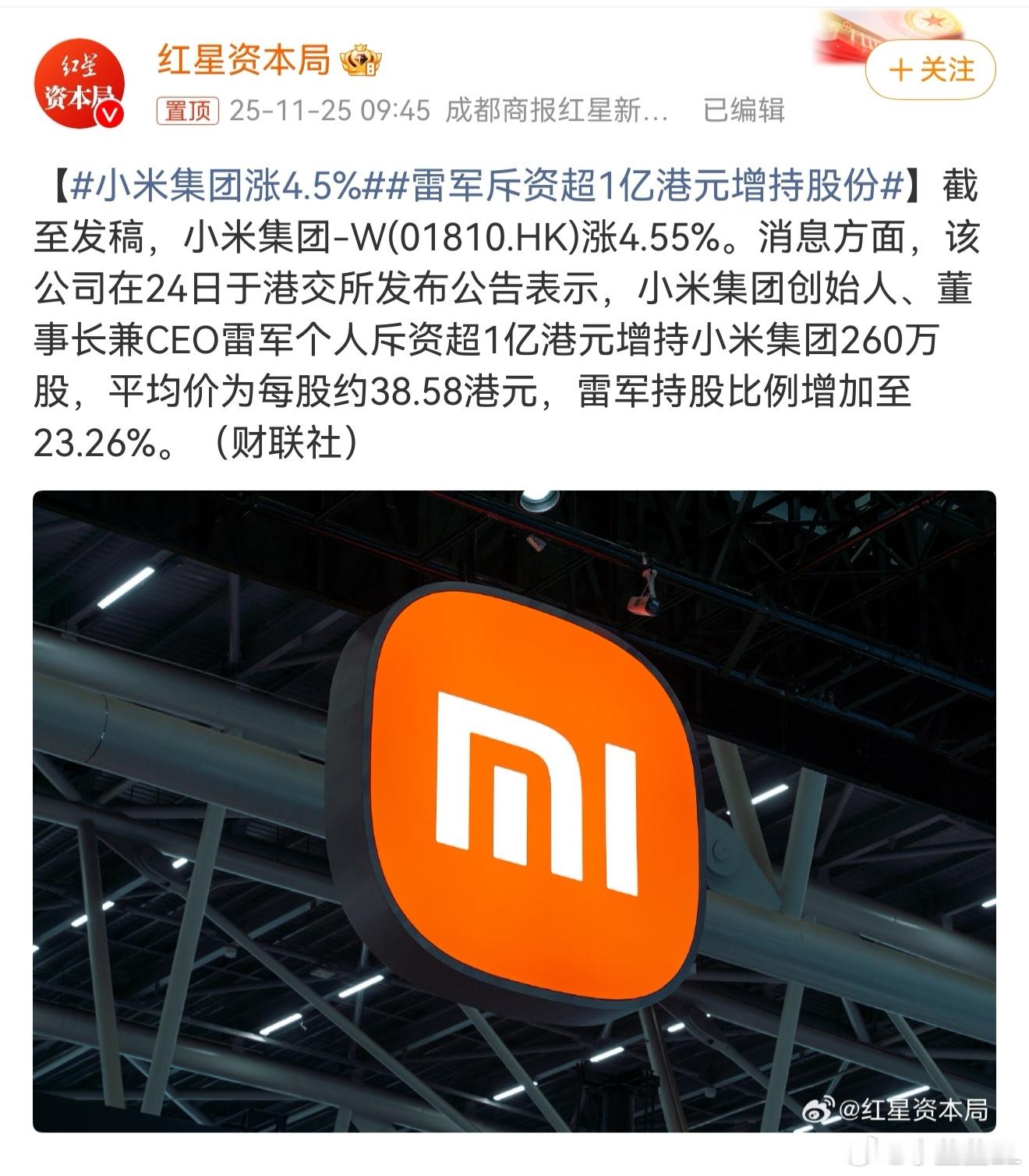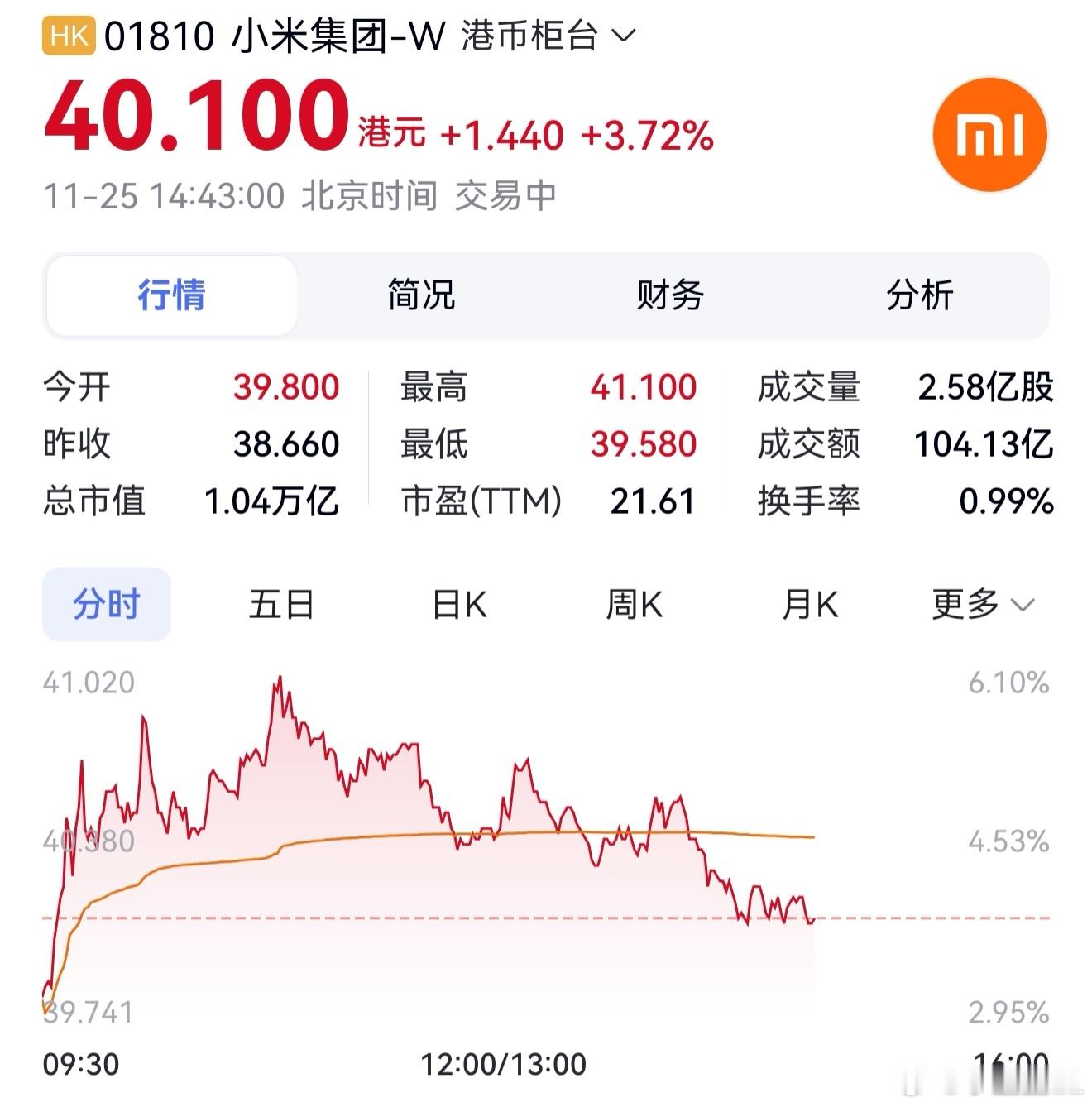 雷总个人花一个亿港元增持真没白花!效果很明显,目前股价又重回40港元以上了。