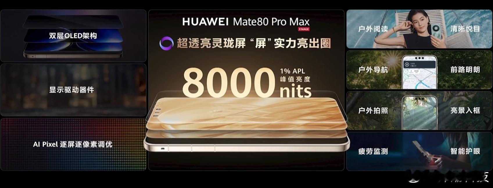 Pro Max在这呢——华为Mate80 Pro Max超透亮灵珑屏,8000nits峰值亮度,双层OLED架构。