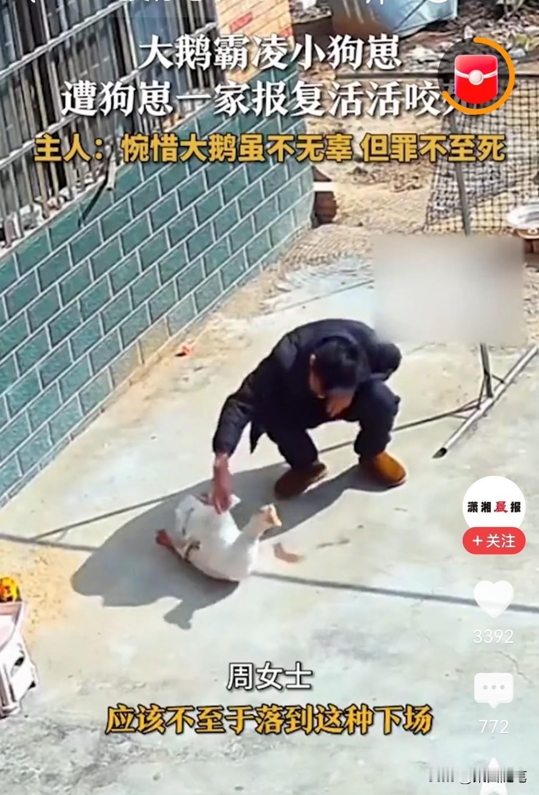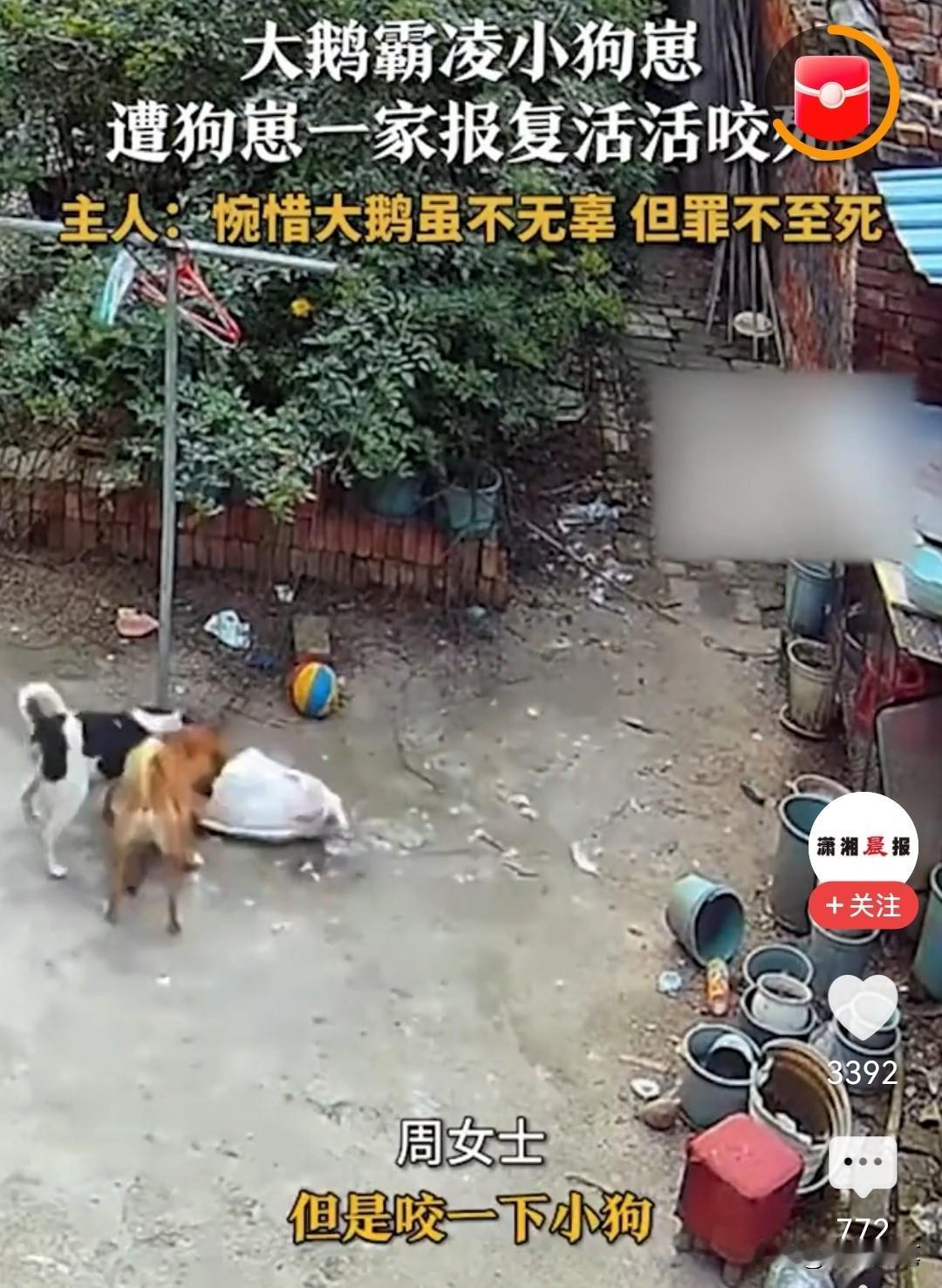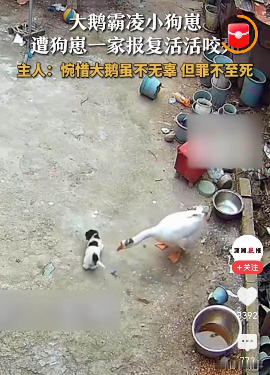 大鹅凌霸小狗崽的视频爆火了。有视频为证。据信,周姓一家养有一条大鹅和几条狗。动物们平时日子过得还和谐。 有一天,大鹅见狗崽一个出来遛弯,突起坏心追咬起小狗崽来。小狗崽一边挣扎逃跑,又一边大喊大叫。这时狗妈妈和狗哥哥姐姐听到呼叫声从狗窝里冲出来,群起而狂咬大鹅,无论大鹅如何求饶也不撒嘴,直到将大鹅咬死为止。 周姓家主听到叫声快步走来,一摸大鹅己死翘翘了。 动物世界也是一个以强欺弱的社会。有坏心的都将不得善终。你有什么想法一起聊聊。
