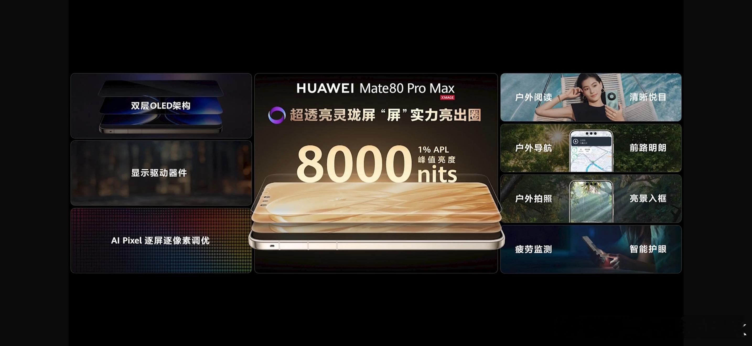 华为Mate 80 Pro Max采用超透亮灵珑屏,这个屏幕确实很强,对比友商屏幕在户外来说屏幕看得更加清晰拥有更高的亮度和更长的寿命,1%APL峰值亮度达到业界最高的8000nits,亮度均匀一致性也更好,双层OLED架构也迎来的进一步升级!