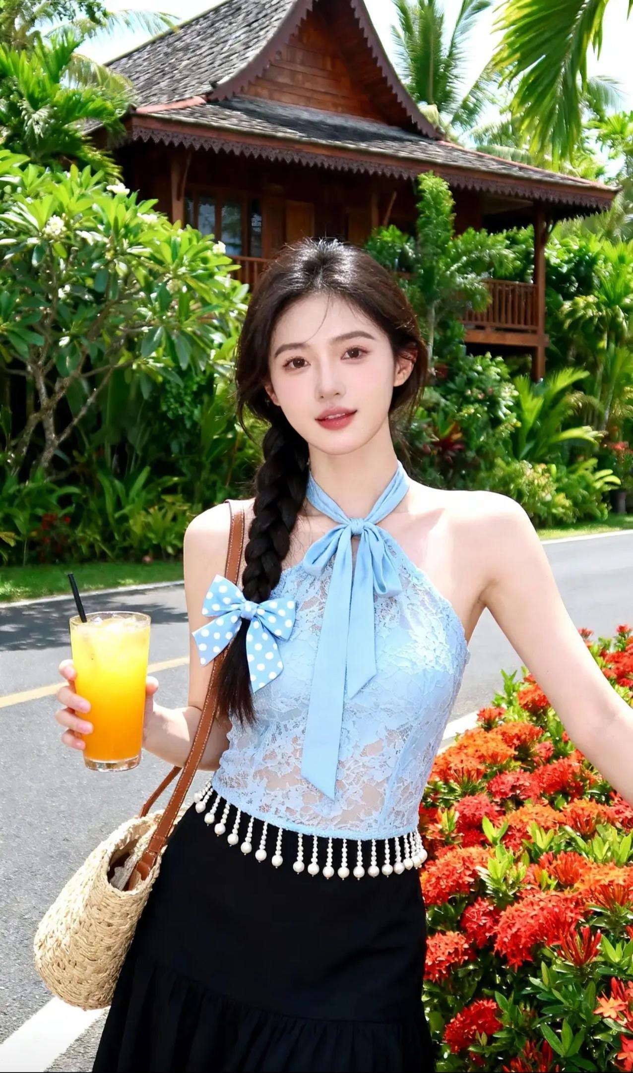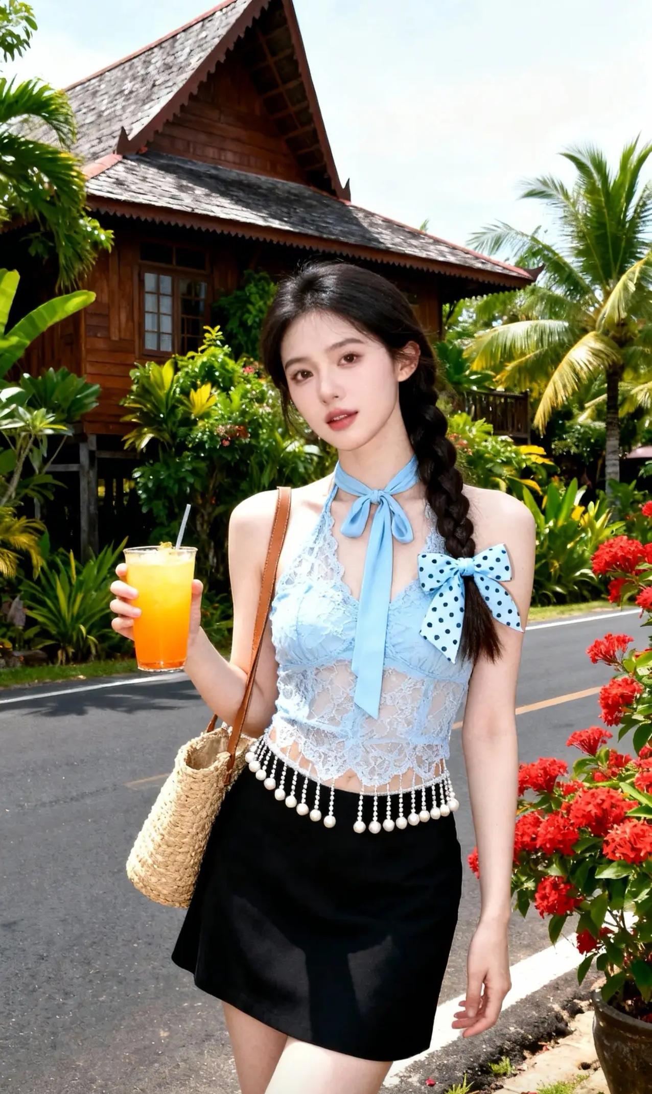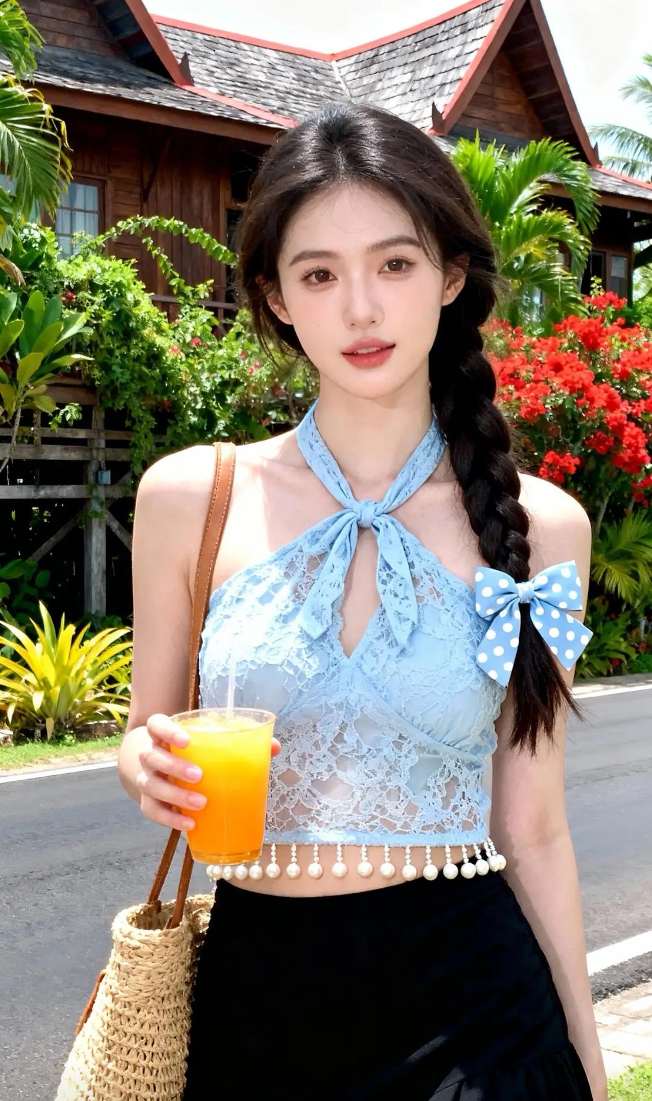 《热带岛屿的夏日邂逅》 碧空如洗的午后,阳光穿过棕榈叶的缝隙,在蕾丝吊带衫上织出细碎的光斑。蓝白波点蝴蝶结随着麻花辫的摆动轻轻摇晃,仿佛两只栖息在乌发间的热带鸟。少女倚着原木栏杆,指尖摩挲着玻璃杯壁凝结的水珠,橙汁里的冰块叮咚作响,应和着远处海浪的节拍。 吊带衫的珠串流苏被海风掀起,掠过黑色纱裙的褶皱时,惊起了藏在裙摆里的光点。她微微侧身,露出颈后系成蝴蝶结的缎带,与背景木屋檐角悬挂的贝壳风铃遥相呼应。足尖轻点地面的瞬间,凉鞋细带上的沙粒簌簌坠落,在木纹地板上绘出星图般的轨迹。 当海风第三次掀起她的裙裾,少女忽然踮脚去够头顶的鸡蛋花。蕾丝肩带滑落至臂弯,露出肩头被阳光吻过的浅蜜色肌肤。背景里艳红的朱槿花簌簌颤动,将花粉撒在她发间的蝴蝶结上,为蓝白波点添了抹金粉。木屋窗棂的倒影斜斜切过她的侧脸,将睫毛的阴影投进盛着橙汁的玻璃杯,恍若沉入琥珀的蝶翼。 暮色初临时,最后一缕斜阳掠过杯沿的柠檬片。少女仰头饮尽残汁,喉间滚动的弧度惊飞了歇在棕榈树上的白鹭。她转身时纱裙旋开墨色涟漪,发梢沾着的鸡蛋花瓣飘向暮色中的海平线,而木屋檐角的风铃正将咸涩的海风,酿成她耳后飘来的柑橘香。