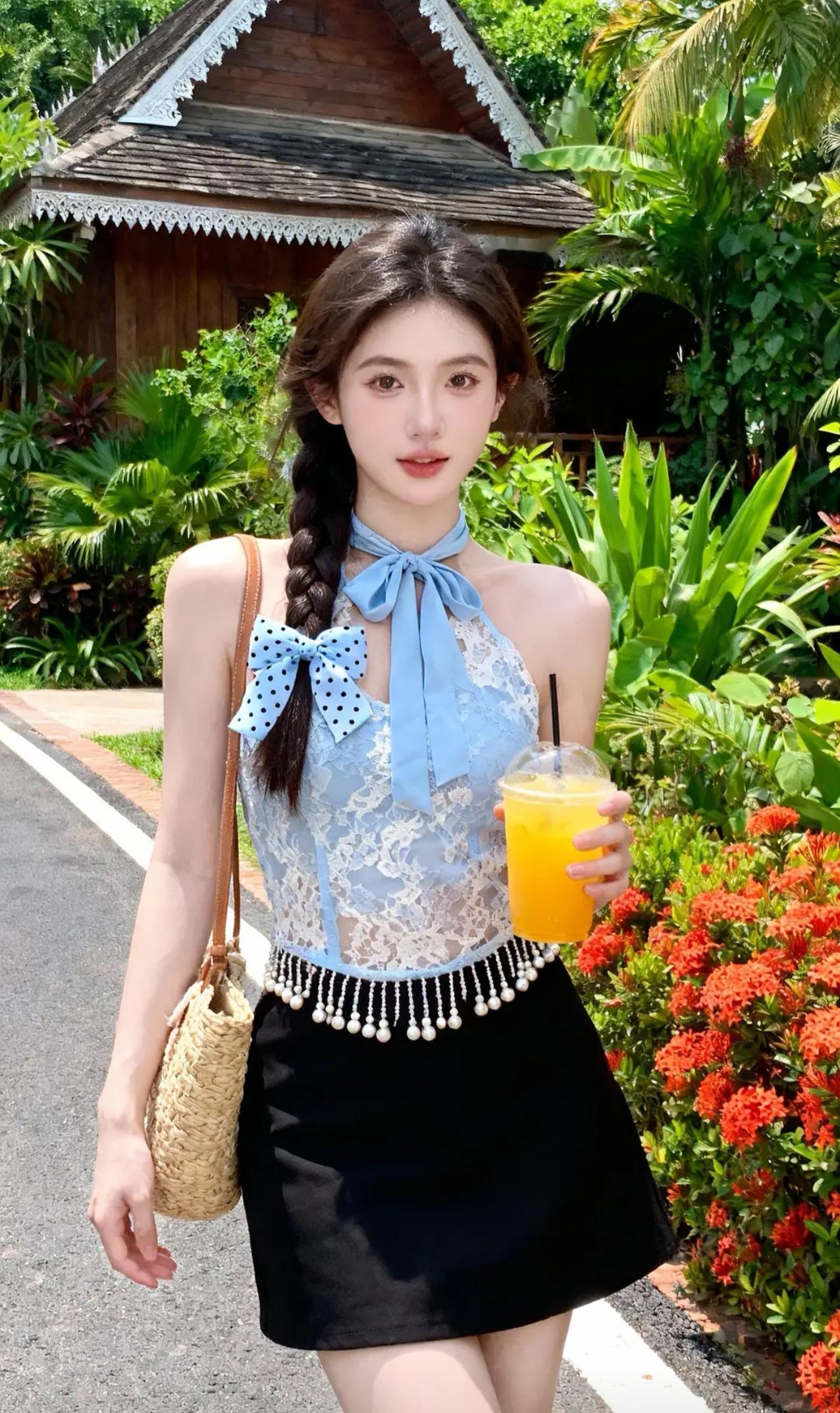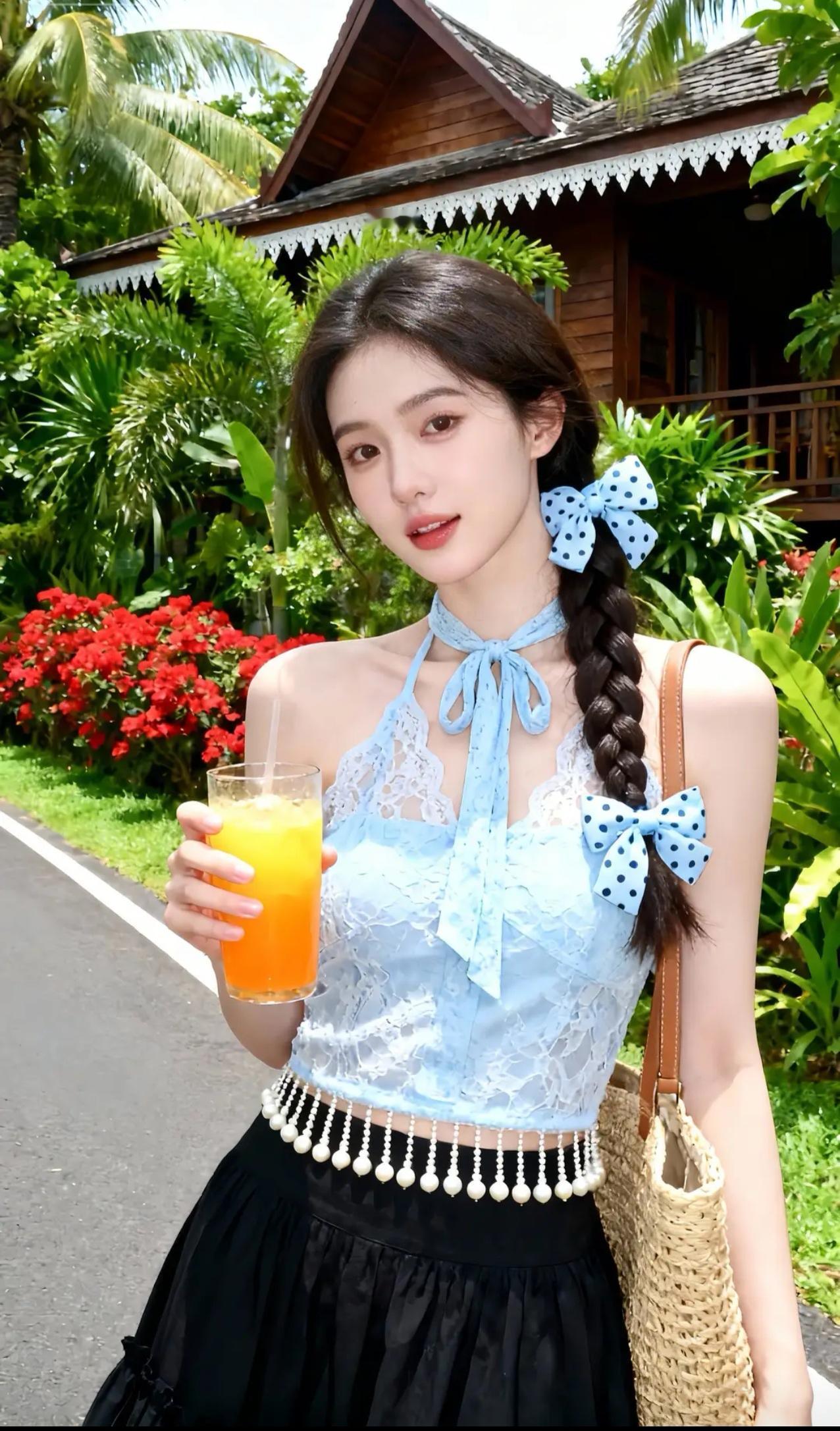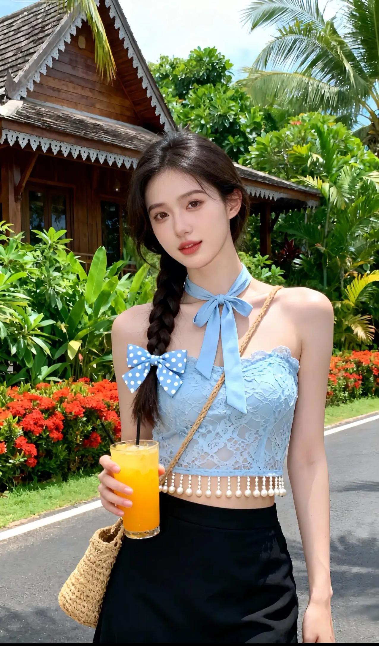 《热带岛屿的夏日邂逅》 碧空如洗的午后,阳光穿过棕榈叶的缝隙,在蕾丝吊带衫上织出细碎的光斑。蓝白波点蝴蝶结随着麻花辫的摆动轻轻摇晃,仿佛两只栖息在乌发间的热带鸟。少女倚着原木栏杆,指尖摩挲着玻璃杯壁凝结的水珠,橙汁里的冰块叮咚作响,应和着远处海浪的节拍。 吊带衫的珠串流苏被海风掀起,掠过黑色纱裙的褶皱时,惊起了藏在裙摆里的光点。她微微侧身,露出颈后系成蝴蝶结的缎带,与背景木屋檐角悬挂的贝壳风铃遥相呼应。足尖轻点地面的瞬间,凉鞋细带上的沙粒簌簌坠落,在木纹地板上绘出星图般的轨迹。 当海风第三次掀起她的裙裾,少女忽然踮脚去够头顶的鸡蛋花。蕾丝肩带滑落至臂弯,露出肩头被阳光吻过的浅蜜色肌肤。背景里艳红的朱槿花簌簌颤动,将花粉撒在她发间的蝴蝶结上,为蓝白波点添了抹金粉。木屋窗棂的倒影斜斜切过她的侧脸,将睫毛的阴影投进盛着橙汁的玻璃杯,恍若沉入琥珀的蝶翼。 暮色初临时,最后一缕斜阳掠过杯沿的柠檬片。少女仰头饮尽残汁,喉间滚动的弧度惊飞了歇在棕榈树上的白鹭。她转身时纱裙旋开墨色涟漪,发梢沾着的鸡蛋花瓣飘向暮色中的海平线,而木屋檐角的风铃正将咸涩的海风,酿成她耳后飘来的柑橘香。