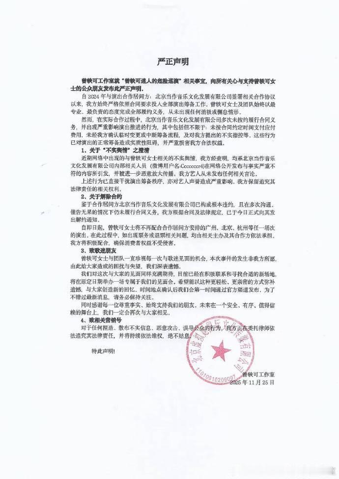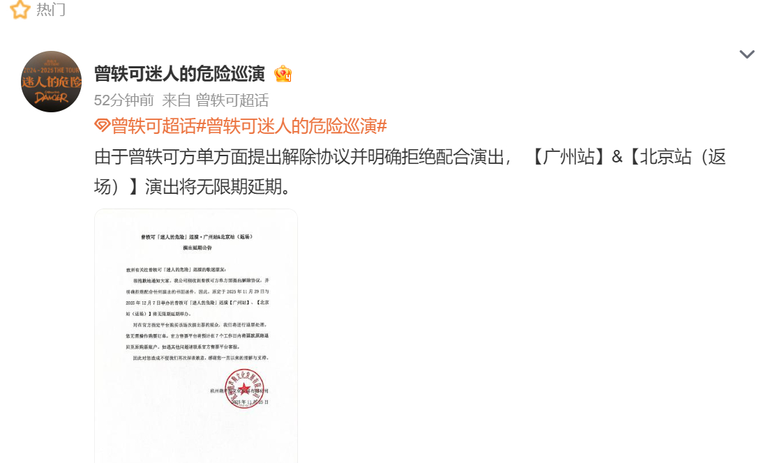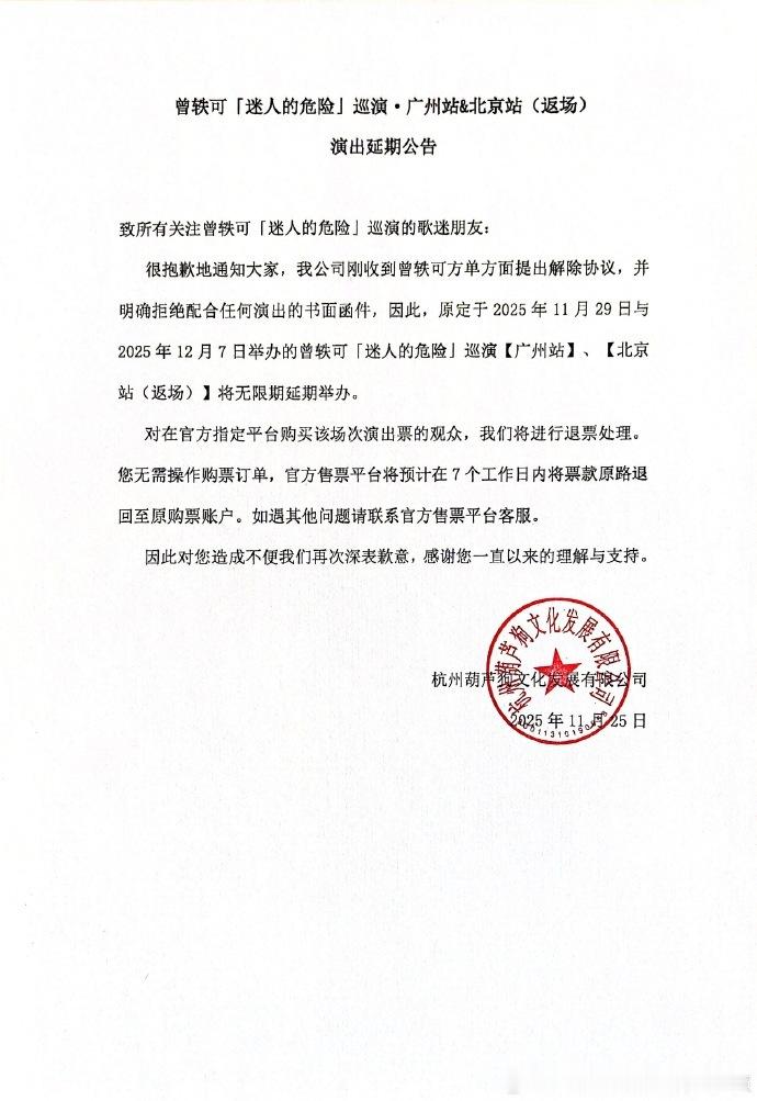 11月25日,曾轶可迷人的危险巡演主办方发布公告称,由于曾轶可方单方面提出解除协议并明确拒绝配合演出,广州站、北京站的演出将无限期延期。此外,主办方在公告中表示,将对购票观众原路退票。据悉,此前曾轶可苏州场因“票房无法覆盖成本”取消,杭州场延期,矛盾持续数月。而曾轶可工作室刚刚也发布声明,指责主办方多次违约,包括未按时付款、擅自变更流程,并散布曾轶可“辱骂工作人员”“消极演出”等不实言论,已正式解约。同时承诺将另办粉丝见面会弥补遗憾。