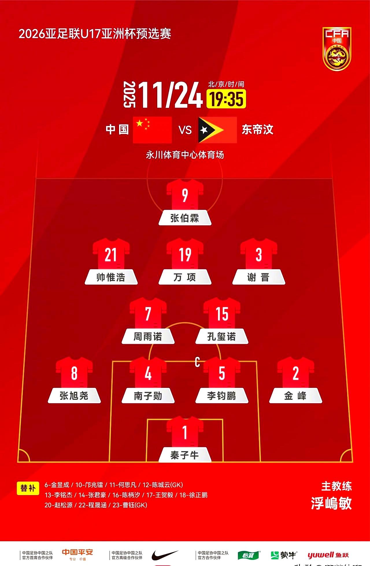 中国队与东帝汶的首发名单已经出炉 中场万项、谢晋首发,前锋张伯霖(上轮替补进球)、帅帷浩(上轮表现好)搭档,后卫金峰首发,球队明显想刷净胜球 东帝汶攻击力不强,中国防线稳得住,前场球员状态都在线,这场肯定能赢,净胜球肯定能刷够,中国队加油!