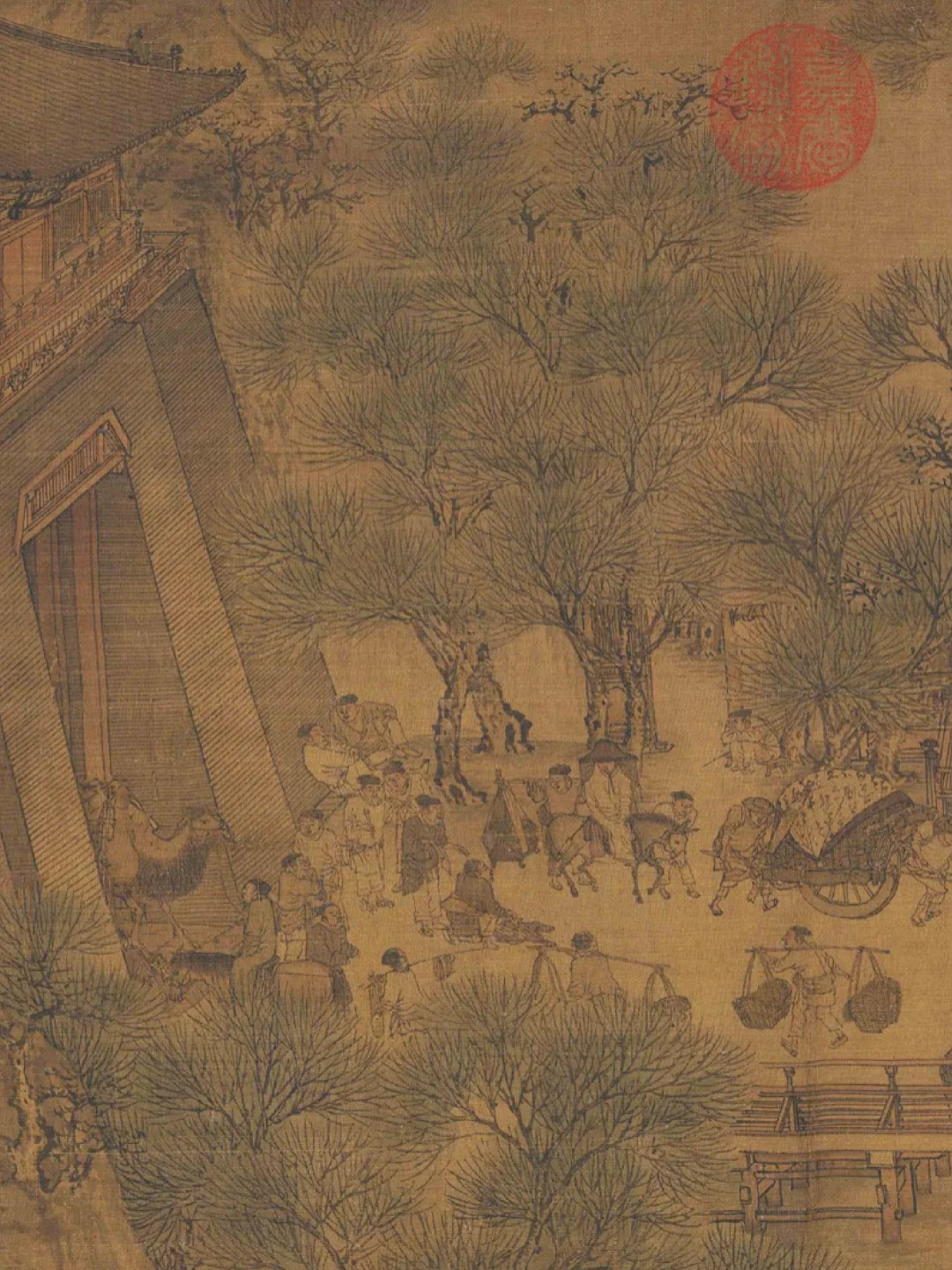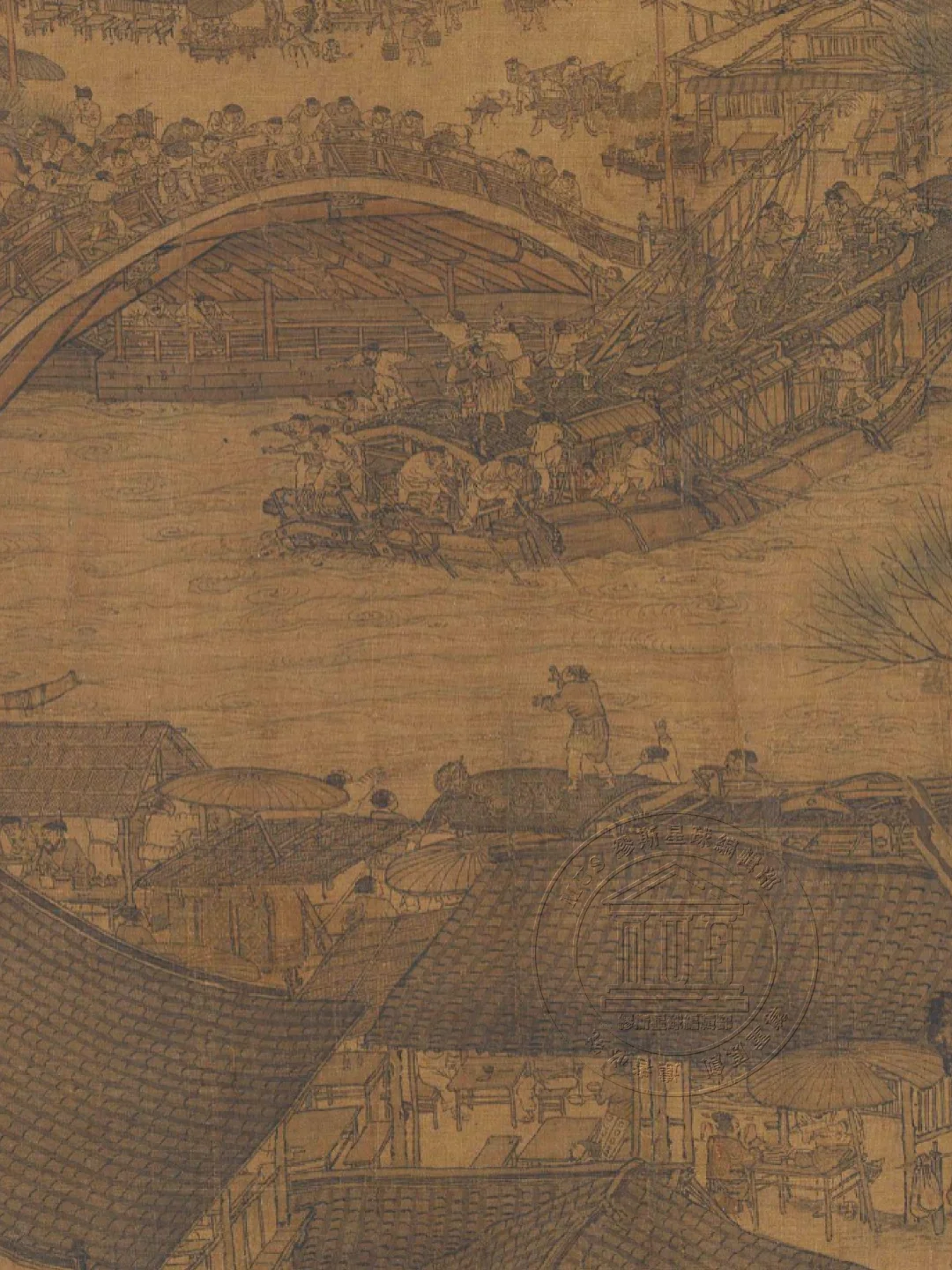 📍这件《清明上河图》是北宋张择端所作的绢本淡设色画,纵 24.8 厘米,横 528 厘米。它描绘了清明时节北宋都城汴京(今河南开封)东角子门内外和汴河两岸的繁华景象,全画分为市郊景色、汴河两岸风光、市区街道三段,生动再现了 12 世纪北宋全盛时期都城的生活面貌。其用笔兼工带写,构图采用鸟瞰式全景法,以散点透视组织画面,虽人物众多、景物繁杂,但长而不冗,繁而不乱。