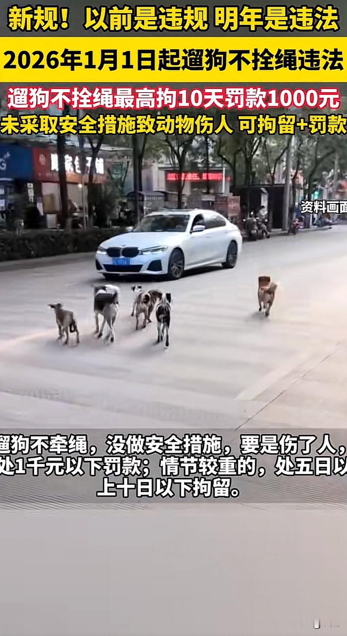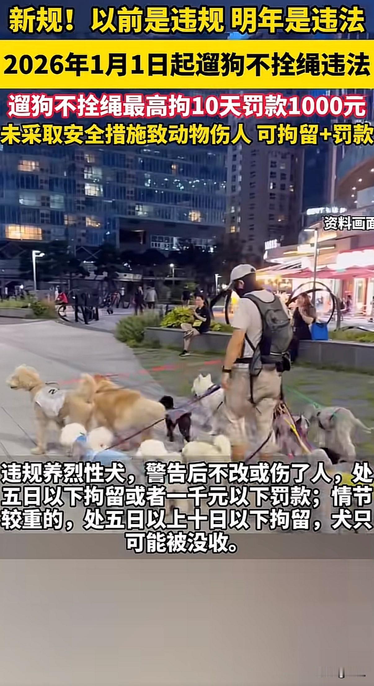 遛狗不拴绳要拘留了!可流浪狗谁管? 刚刚刷到新闻,2026年开始遛狗不拴绳真要违法了。 最高能拘10天,罚1000块。 这次新规是动真格的。 不光咬伤人要罚,就算狗没碰到人,只要把人吓摔倒也算。 江苏有个案例,一只没拴绳的大狗追人,路人躲闪时摔成九级伤残。法院判狗主人赔了28万。以后这种情况还要加上拘留。 烈性犬管理更严格。 藏獒、杜宾这类禁养犬,只要敢养就直接警告。不听话或咬人的,直接进去蹲5-10天。 看到这里我拍手叫好。 小区里总有人遛大型犬不牵绳,孩子吓得往家长身后躲。主人还慢悠悠说“我家狗不咬人”。 现在这句话代价大了。 不过有个问题绕不开。 规定对养狗人是紧箍咒,可满街流浪狗怎么办? 被遗弃的宠物狗谁来管? 新法只规定了养犬人责任,但虐待、遗弃动物的处罚还是空白。 昨天看到个视频,三只小狗被扔在垃圾堆边发抖。 如果遗弃成本还是零,会不会有人为逃避罚款,直接把狗扔出门? 到时候流浪狗问题更严重,咬伤人又找不到主人。 法律往前走是好事。 这根绳子不再是简单的工具,而是法律红线。 但希望下一步能把遗弃和虐待的漏洞补上。 养宠是责任不是玩具,这句话需要法律来背书。 大家觉得呢?你们小区遛狗牵绳的多吗?