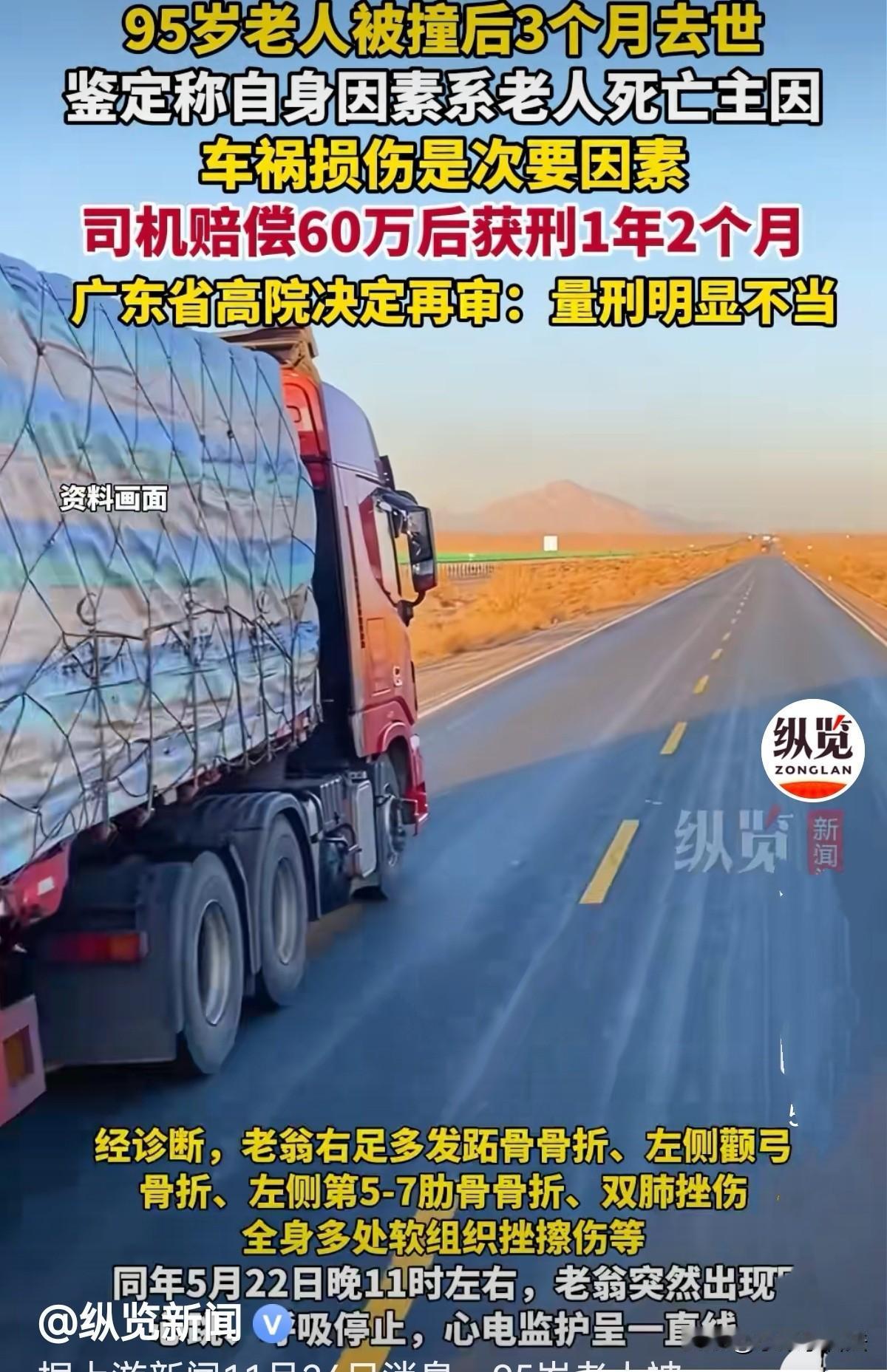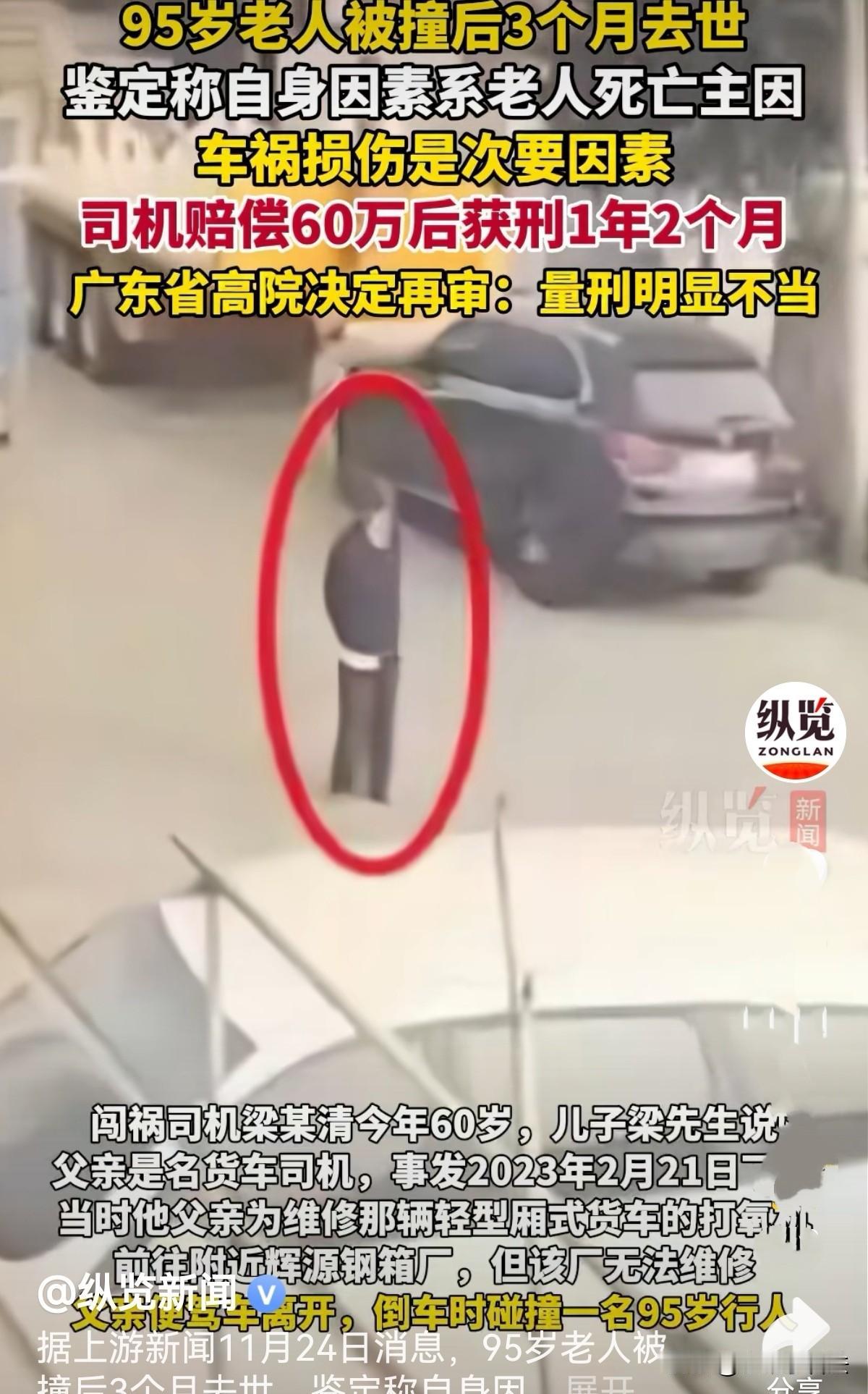 广东广州,60岁男子是名货车司机,倒车时撞倒95岁一老人,3个月后老人离世。交警认定男子担车祸全责,司法鉴定称自身因素系老人死亡的主要原因,车祸损伤是次要因素。而男子未得到老人家属谅解。一审法院判男子60多万赔偿获刑1年2个月。男子及家人不服,锲而不舍地上诉,再诉,两年后,高院认为量刑明显不当决定再审! 60岁的梁某清是名经验丰富的老货车司机,他开车技术娴熟且专业。 2023年2月21日下午,他受林某委托,驾驶轻型厢式货车前往钢箱厂维修打氧机。 因工厂无法维修,他驾车离开时在厂区门前道路倒车,突然听到异样声响,下车后竟发现一位老人倒在车轮旁。 梁某清瞬间慌了,这老人怎么跑到车后面了? 他深知老人年事已高,这一撞后果难料,当即拨通120急救电话和110报警电话,看着救护车将老人送往医院,又配合赶来的交警完成调查,全程紧绷着神经,陷入愧疚与不安。 被撞老人黄某已是95岁高龄,经医院诊断,其右足多发跖骨骨折、左侧颧弓骨折、肋骨骨折、双肺挫伤等多处损伤。 梁某清及家人多次提着礼品前往医院探望,反复赔礼道歉,内心期盼能获得老人家属的谅解,可每次都被对方拒绝。 这让梁某清心里愈发沉重,隐约察觉到后续的麻烦不会小。 谁也没想到,3个月后的5月22日晚,黄某突然出现心跳呼吸停止,因家属不同意有创抢救,经医护人员全力救治无果后,家属放弃抢救,老人宣告死亡。 事故责任很快有了定论。2023年3月,交警支队出具认定书,认定梁某清倒车时未察明车后情况,承担事故全部责任,黄某无过错。 《道路交通安全法实施条例》第50条规定:机动车倒车时,应当察明车后情况,确认安全后倒车。不得在铁路道口、交叉路口、单行路、桥梁、急弯、陡坡或者隧道中倒车。 而关于死因的鉴定结果,却让案件争议初现。 司法鉴定中心于同年10月出具意见,明确黄某自身高龄导致免疫力和恢复能力低下,且患有多种慢性疾病,交通事故所致损伤仅为次要因素,自身因素才是死亡主因。 黄某的儿女因父亲遭遇交通事故受伤身亡,悲痛欲绝。 2024年9月,将梁某清及、车主及保险公司告上法,要求赔偿死亡赔偿金29.6535万元,精神损害抚慰金80000元,丧葬费75935元,医疗费13.7万余元等,共计约64.65万元。 扣除保险垫付的18000元医疗费,再扣除事发后车主林某垫付的10000元,共计约61.85万元。 《民法典》第1173条规定:被侵权人对同一损害的发生或者扩大有过错的,可以减轻侵权人的责任。 被告两个保险公司主张黄某自身因素是导致其死亡的主要原因,据此两被告保险公司承担的责任不超过30%。 法院审理认为,黄某高龄和慢性疾病属于自身客观体质状况,并非法律意义上的“过错”。 民事侵权赔偿侧重过错责任,梁某清负事故全责,其侵权行为是引发后续损害的诱因,不能因受害人自身体质特殊就减轻其赔偿责任。 驳回了保险公司以老人自身为死亡主因而主张仅承担30%责任的诉求。最终判决保险公司赔偿60.2万余元。 然而,在2023年11月26日上午,梁某清接到交警电话说有事找他,前往后直接被控制,次日因涉嫌交通肇事罪被刑拘。 虽随后取保候审,但这段经历让他整日提心吊胆,夜里常常辗转难眠。 2024年9月,江城区检察院以交通肇事罪对梁某清提起公诉。 《刑法》第131条规定:违反交通运输管理法规,因而发生重大事故,致一人死亡且负事故全部责任的,构成交通肇事罪,处3年以下有期徒刑或者拘役。 梁某清倒车时未察明车后情况,撞伤黄某致死,交警认定其负事故全部责任,构成交通肇事罪。 《刑法》第67条第1款规定,对于自首的犯罪分子,可以从轻或者减轻处罚。 梁某清事发后主动拨打120和110,如实供述罪行,构成自首,本就具备从轻处罚情节。 最后一审判梁某清1年2个月有期徒刑。 梁某清的儿子梁先生满心困惑又愤怒,他想不通父亲已承担了赔偿责任,鉴定也明确车祸只是次要死因,为何还要承受一年多的牢狱之灾? 他们不服一审判决,提起上诉。法院二审驳回上诉维持原判,申诉也被驳回。 交通事故只是造成黄某死亡的次要原因,保险公司也已将60多万赔偿款赔付到位,为什么还让父亲坐牢? 梁先生不死心,再次向高院提出申诉。 《刑事诉讼法》第253条中的“有新的证据证明原判决、裁定认定的事实确有错误,可能影响定罪量刑”的再审条件,启动再审程序。 高院启动再审的依据是《刑事诉讼法》第254条第2款 。 2025年9月,高院经审查认为原审生效裁判存在问题,经审判委员会讨论决定提审,再审期间中止原判决执行。 目前,案件再审开庭时间尚未确定,但这一决定已然让梁某清一家悬着的心稍稍放下。 您觉得,交通事故只是黄某死亡的必要原因,对方已进行赔偿,司机还该不该入刑呢?