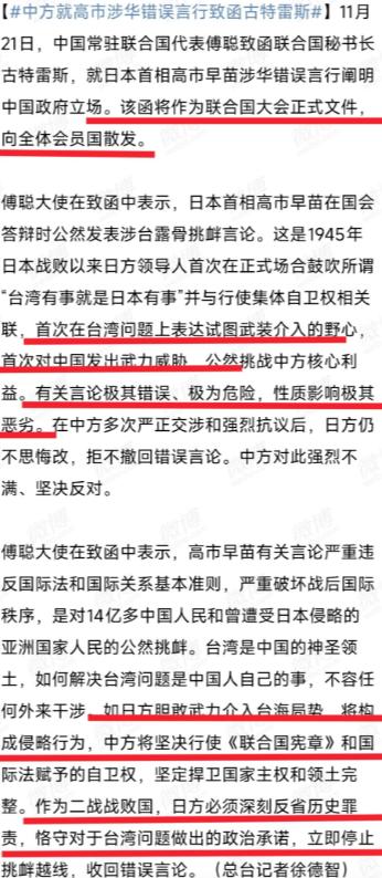 中国通过联合国,向193个国家发文件,如果揍日本谁也别说三道四!   中国最近这步棋太妙了!借着联合国的平台,直接把《联合国宪章》里的 “敌国条款” 摆到 193 个国家面前,等于明着说:要是日本敢再搞侵略、插手台海,我们动手收拾它,谁都没资格说三道四。   这可不是简单的外交喊话,而是给中国之后的发展,铺好了最稳的 “法理安全路”。   先得说这文件的分量有多沉,里面直指《联合国宪章》第 53 条和第 107 条,这可是 80 年前用 3500 万生命换来的规矩 —— 德日意这些战败国要是再犯侵略,中英美等战胜国不用安理会投票,直接就能动武。   中国驻日使馆特意用中日双语发文,还让常驻联合国代表傅聪致函秘书长古特雷斯,等于把法理依据砸在了全世界面前,日本网民都慌了,纷纷骂高市早苗 “惹了天大的祸”,这就是法理威慑的威力。   总之,在联合国平台援引“敌国条款”的举措,是一次极其成功的“法律外交”实践,它告诉我们,中华民族的伟大复兴必须在国际法和历史正义的框架内坚定前行。   前方的道路依然需要审慎应对,但只要我们坚持原则、把握大势、敢于亮剑,就一定能够有效维护国家主权、安全、发展利益,最终实现中华民族的伟大复兴并为人类和平与发展事业作出更大贡献。   以上是小编个人看法,如果您也认同,麻烦点赞支持!有更好的见解也欢迎在评论区留言,方便大家一同探讨。