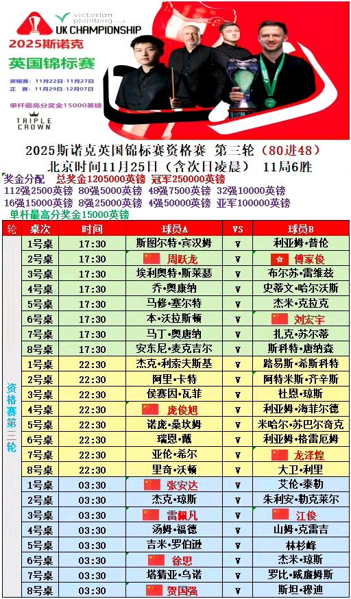 2025斯诺克英锦赛资格赛第三轮出现大量爆冷现象,头号种子韦克林3-6不敌曼恩,佩奇3/6不敌排名更低的霍尔特,世界冠军布雷切尔3-6不敌伯恩斯。 第三轮一共有13名中国球员参赛,目前已经晋级审判轮的中国球员有3名:吕昊天、袁思俊、周跃龙。傅家俊0-4落后,中场休息时退赛。