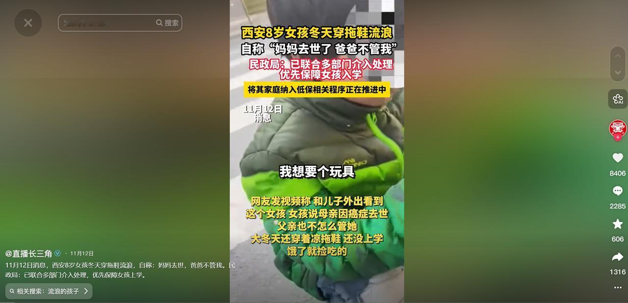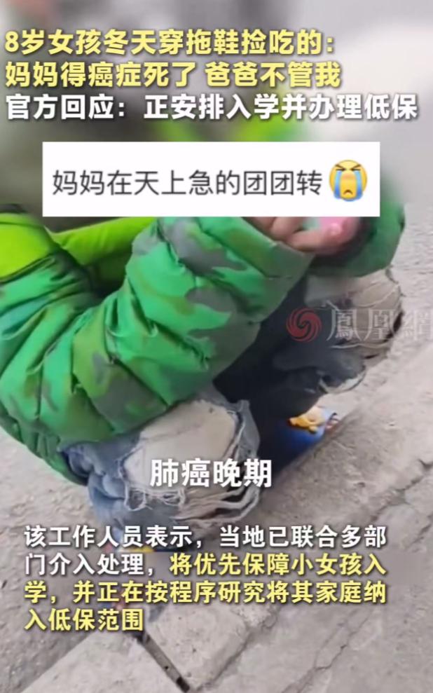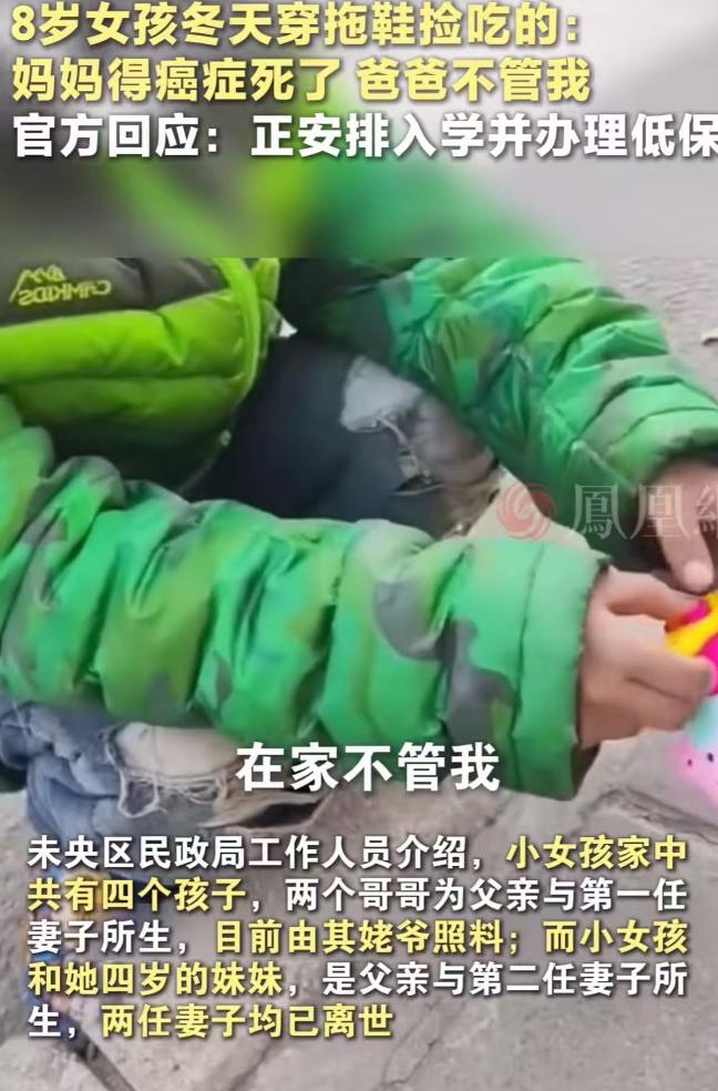 看的人眼泪直流!陕西西安,8 岁女孩冬天只穿一双拖鞋,在路上捡吃的!一位女子看到后,问她妈妈呢?没想到女孩说:“妈妈得癌症死了,爸爸不管我……”网友:真是没妈的孩子是根草啊!她妈妈在天上肯定急得团团转! 那是个只有 8 岁的小姑娘,个头小小的,干瘦的身板在寒风里像片随时会被吹走的落叶,最让人揪心的是她的穿着,脚上竟然只趿拉着一双破旧的棉拖鞋,鞋底都快磨平了,连双袜子都没有,冻得通红的小脚就那么直接暴露在冷风中,她的裤腿烂得不像样子,像是被什么东西撕扯过,破洞处冷风直往里灌,把她的身子吹得止不住地发抖。 可这孩子似乎完全没顾及寒冷只是蹲在路边,冻得发紫的小手在地上摸索着,路过的人看清了,她在捡别人丢弃的吃食,不管是掉在地上的面包屑,还是别人吃剩扔掉的零食,她捡起来稍微擦一下,就毫不犹豫地往嘴里塞。 那份麻木和平静,根本不像一个 8 岁孩子该有的样子,看得人心头发紧,鼻子一酸,眼泪就忍不住往下掉,一位路过的女子实在看不下去,悄悄凑了过去,后来大家才知道,她轻声询问了孩子的情况。 而孩子的回答让所有人都心头一沉 ,妈妈得癌症去世了,爸爸根本不管她,这简单的一句话,从一个还没长大的孩子嘴里说出来,轻得像一声叹息,却重得让人喘不过气。 后来随着事情发酵,大家才慢慢了解到这个家庭的困境,这孩子的家早就散了,她的爸爸先后娶了两任妻子,可两任妻子都没能留住相继离世,留下了四个同父异母的孩子。 两个哥哥还算幸运,被姥姥接走了算是逃离了这个苦窝,只剩下她和 4 岁的小妹妹,跟着年纪大了、走路都颤颤巍巍的爷爷奶奶生活,可爷爷奶奶本身就自顾不暇,而她们的爸爸,整天窝在家里不干活,对两个女儿不管不顾,让这两个孩子彻底没了遮风挡雨的屋檐。 这孩子原本还上过半年学,可后来不知怎么就辍学了,在那些漫长的日子里,本该充满琅琅书声的校园,似乎从来没人执着地追问过她为什么没来上学,村里的干部明明知道这家的情况,却也没人主动上门看看。 在西安这座忙碌运转的城市里,她就像一株被遗忘的野草,独自对抗着严寒与饥饿,不知道这样艰难的日子,她已经熬了多久,直到好心女子把这一幕拍下来发到网上,短视频瞬间掀起了惊涛骇浪,无数网友被戳中了泪点。 大家看着视频里那个穿着拖鞋捡吃的小女孩,纷纷留言:“真是没妈的孩子是根草啊,太让人心疼了”“她妈妈在天上看着,肯定急得团团转,却没办法帮到女儿”“这么小的孩子,本该在妈妈怀里撒娇,却要在寒风里捡东西吃,爸爸怎么能这么狠心”。 舆论发酵后,民政局、教育局、福利院的工作人员才像是被唤醒了一样,纷纷赶了过来,给孩子送来了棉衣棉鞋、米面粮油,帮她安排入学办理低保,一系列补救措施做得轰轰烈烈,可看着孩子终于穿上暖鞋、吃上热饭的样子,心里却总觉得不是滋味,这份温暖来得实在太晚了。 如果没有那位好心女子的驻足,如果没有镜头的记录,如果这一切都发生在无人看见的角落,这个 8 岁的孩子,还要在冷风中冻多久?还要捡多久别人丢弃的吃食?她那双冻得通红的小脚,还要在冰冷的路面上走多久? 网友们的心疼不是没有道理,哪个妈妈舍得让自己的孩子受这种罪?如果妈妈还在肯定会把她打扮得干干净净,冬天给她穿上厚厚的棉鞋,让她吃饱穿暖,坐在教室里安心读书,可现在孩子只能靠着自己的坚韧活着,在没有光的地方努力维持着生命。 希望这孩子以后能真正过上安稳的日子,有暖鞋穿有饱饭吃,能在教室里读书,能感受到来自这个世界的善意,也希望更多人能多留意身边的困境儿童,不要让他们再像根没人疼的草一样,在风雨里独自飘摇,毕竟每个孩子都该被温柔以待,这世上不该有那么多让人心疼到掉泪的遭遇。 (信息来源:长江新闻)