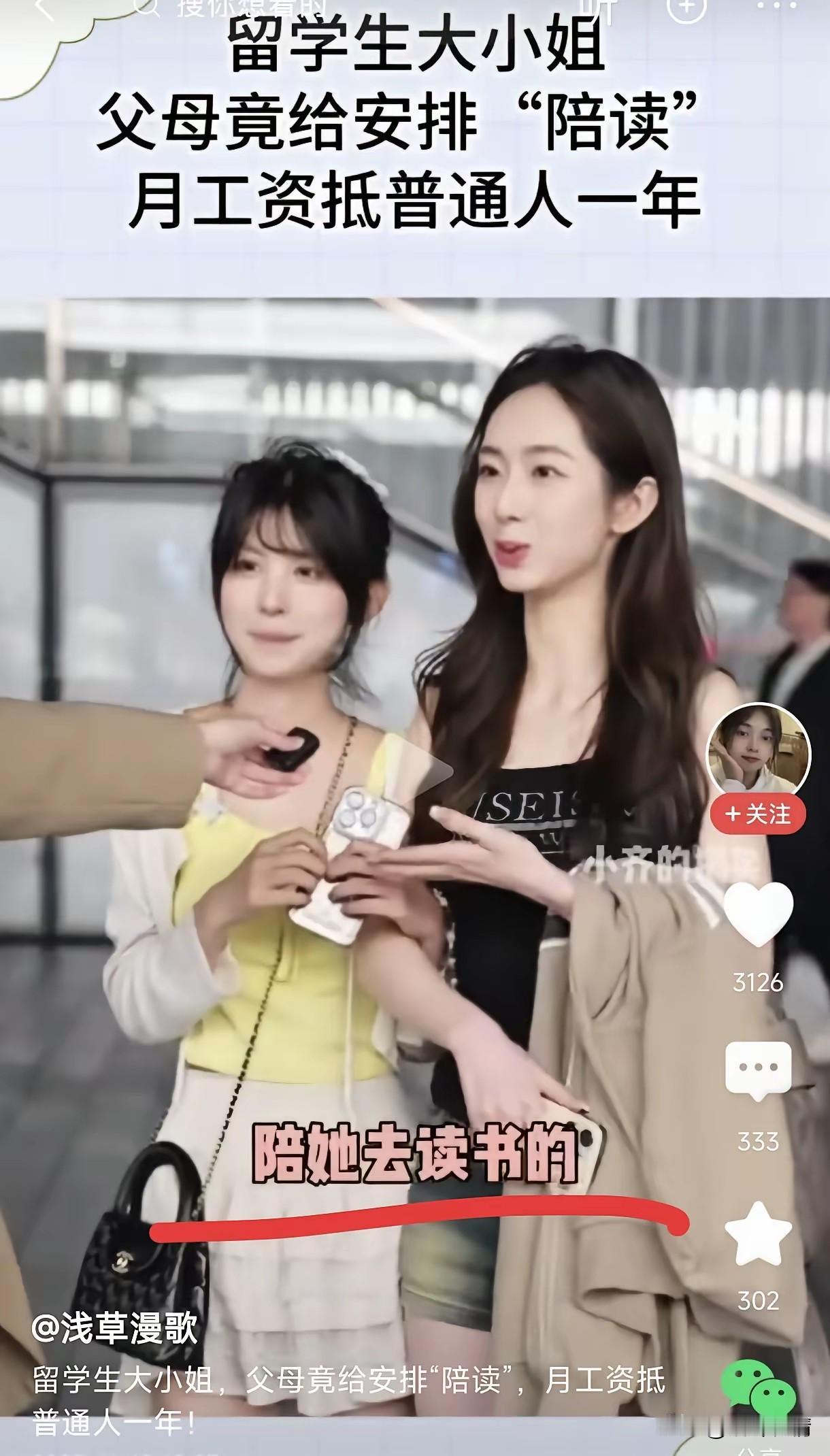现在有钱人家的女子上学还要陪读, 黑衣女孩正是黄衣女孩的陪读, 古代男子读书确实有个陪读, 如今现代社会女子读书也有陪读, 不知道这样的陪读有什么作用, 是会给她讲题, 还是上大学的时候盯着她, 报告大小姐的一举一动, 阻止大小姐恋爱找男友吗? 姑娘家的早晚要嫁人, 有陪读的大小姐有自由嘛? 看得出来两人的关系很好, 黄衣女孩长相一般,个子还低, 不知道的还以为她是丫鬟, 看见两位还是在国外读书, 黑衣女孩的留学费用全部由黄衣女孩的父母承担,还给她发6000多美元, 现在有钱人家的女孩留学还真是费钱? 大家对于有钱人家女孩留学还有陪读怎么看? 留学让自己的孩子去外国留学,你是否支持 陪读 家庭陪读 高中陪读妈妈 莘莘学子陪读