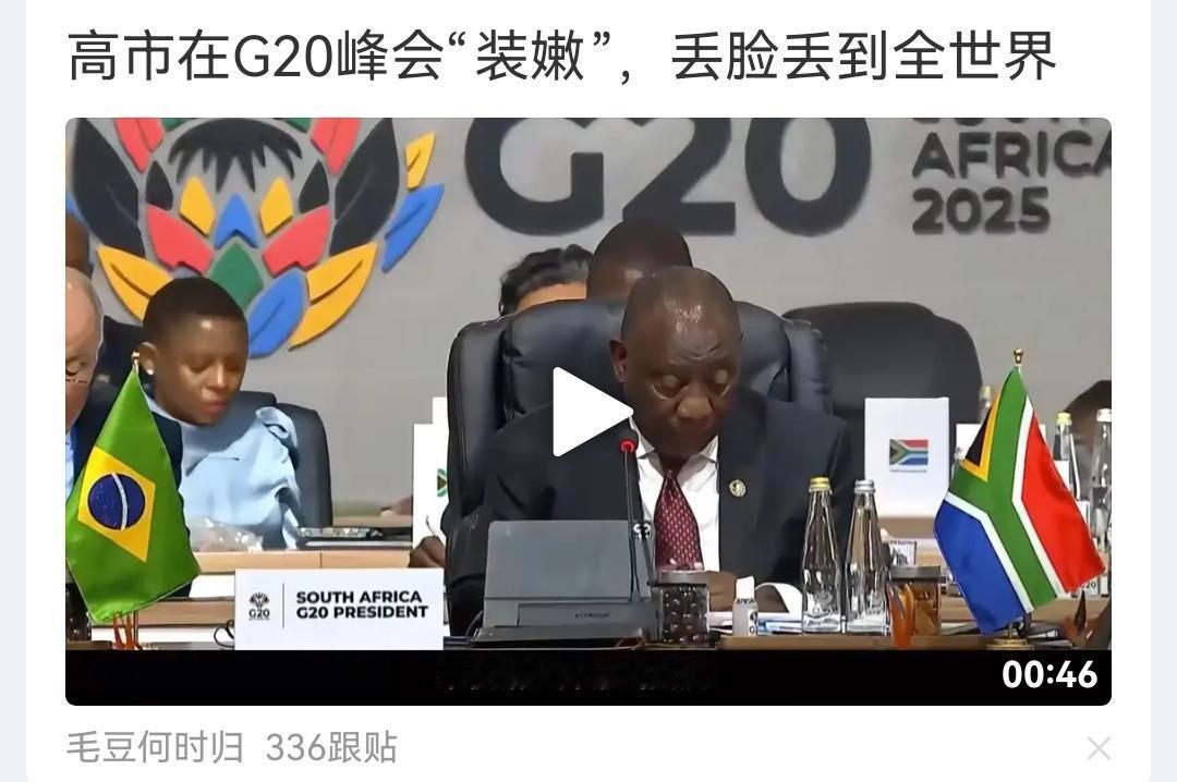 怎么看到的都是高市早苗在G20峰会上的丑态,有的说穿衣服挑来挑去,有的说动作夸张丢人现眼,有的说东张西望没人理,都是这些表面上的东西,那么她在G29峰会上的正式会见和论坛上发表了什么谬论?有哪些观点被公开批判?她的什么政治立场被大会孤立和批判?得道多助失道寡助,高市早苗不可能有什么成果,应该揭露高市早苗的卑劣的政治表演,批判他的军国主义反动本质和危害。纠缠那些鸡毛蒜皮的东西没啥用处。