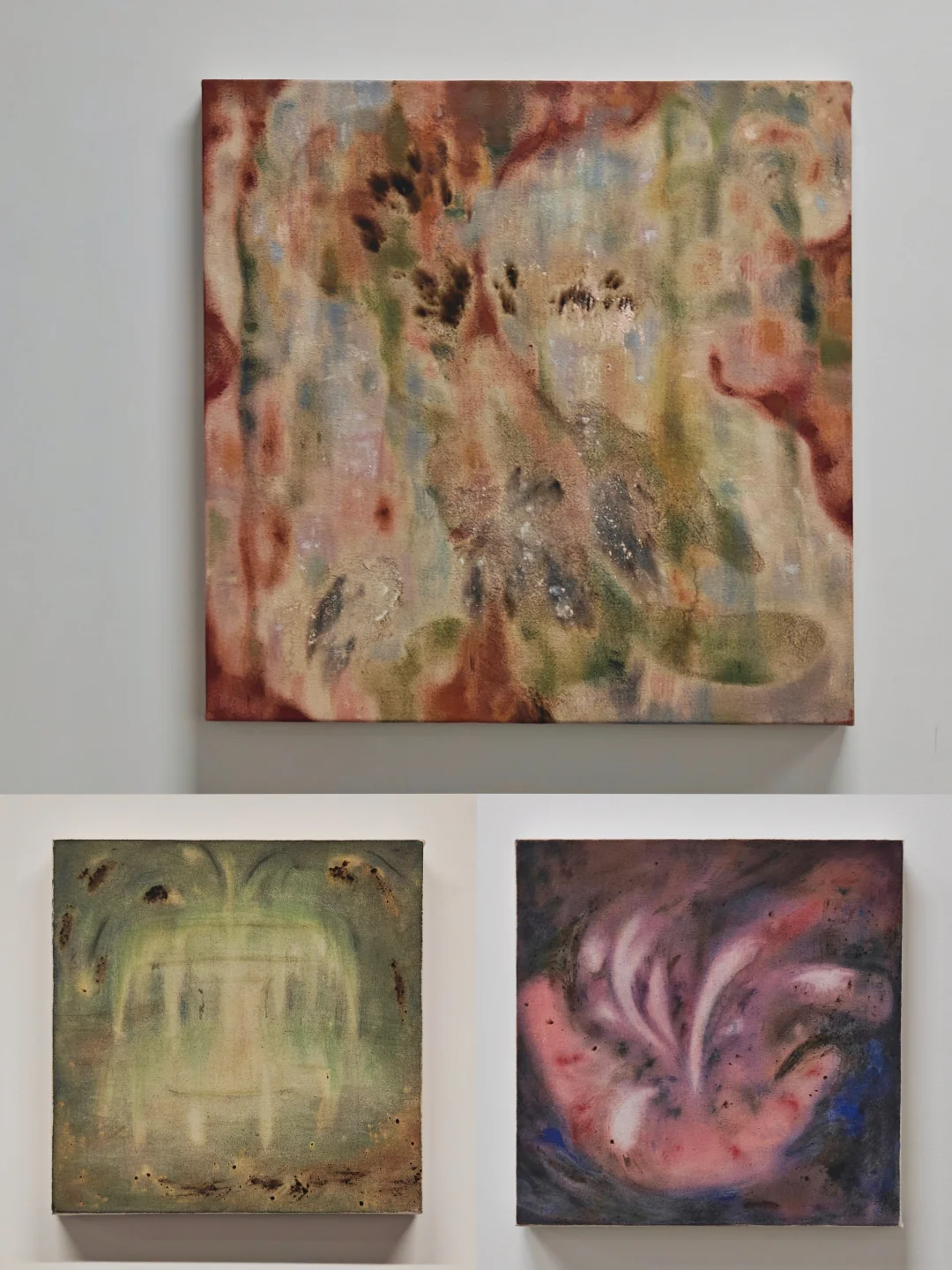 🖼艺术家自制亚麻画布,利用高锰酸钾染料的渗透、扩散与褪色形成画面结构,模仿潮汐涨落或山林风动的自然韵律。