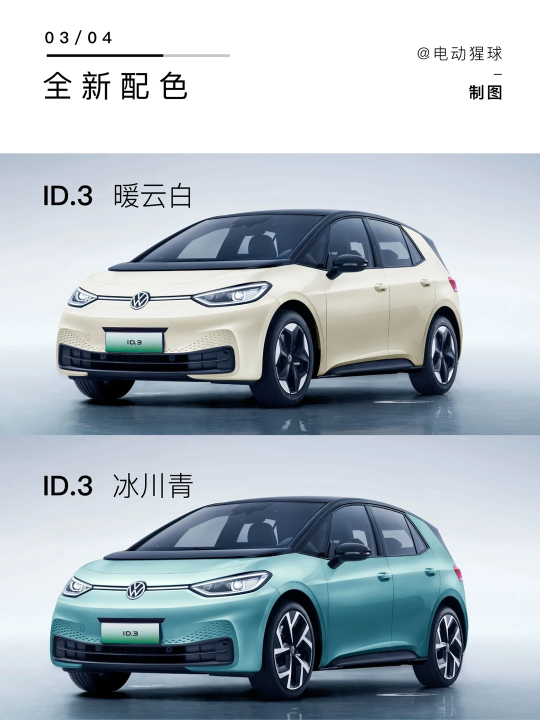 2025 款 ID.3 新增冰川青和暖云白车色,冰川青是莫兰迪色系,高级又独特,开在路上回头率超高;暖云白超耐看,简约又大气。这两个新颜色直接把 ID.3 的颜值拉高几个档,满足你对个性和审美的追求