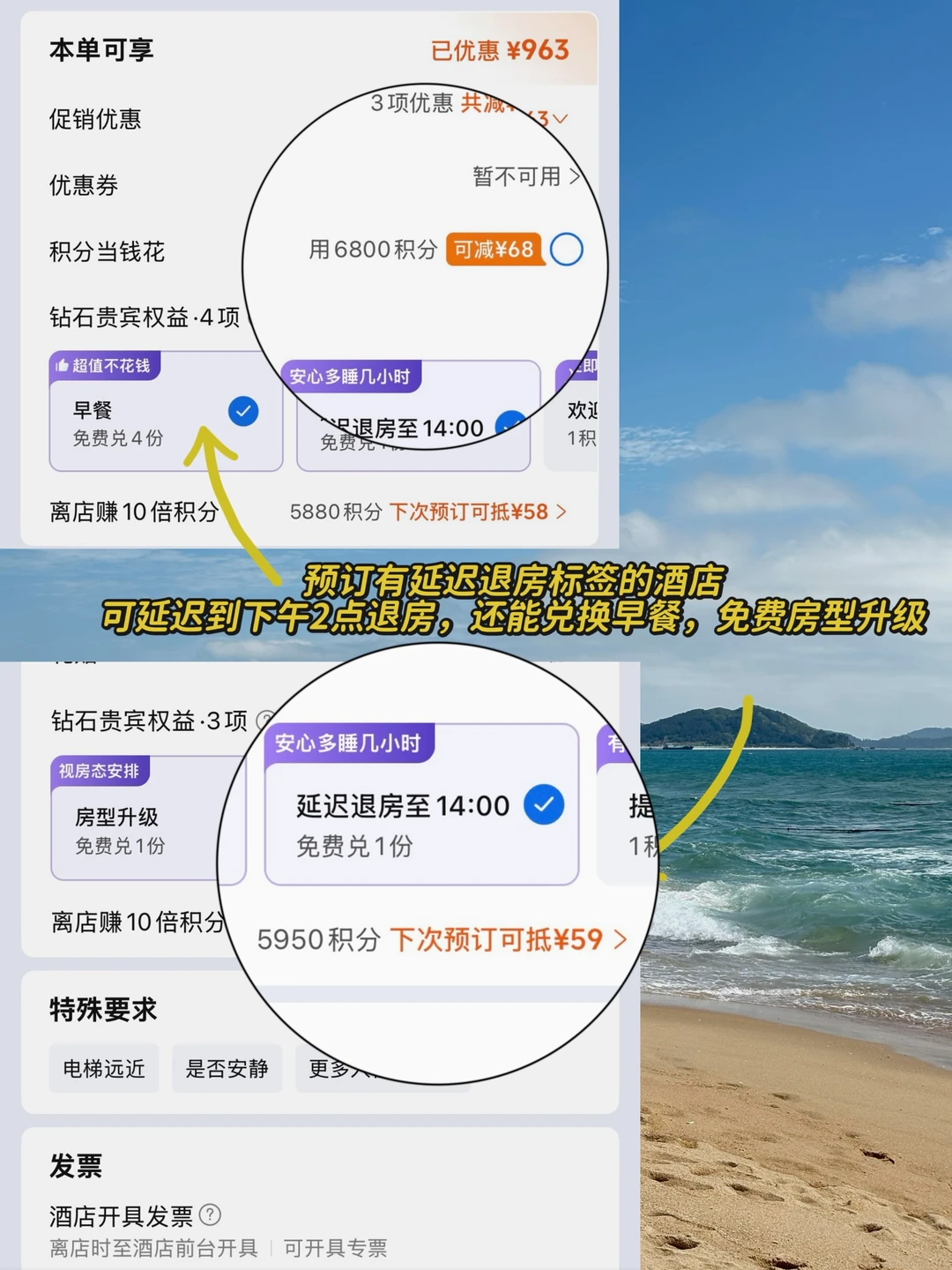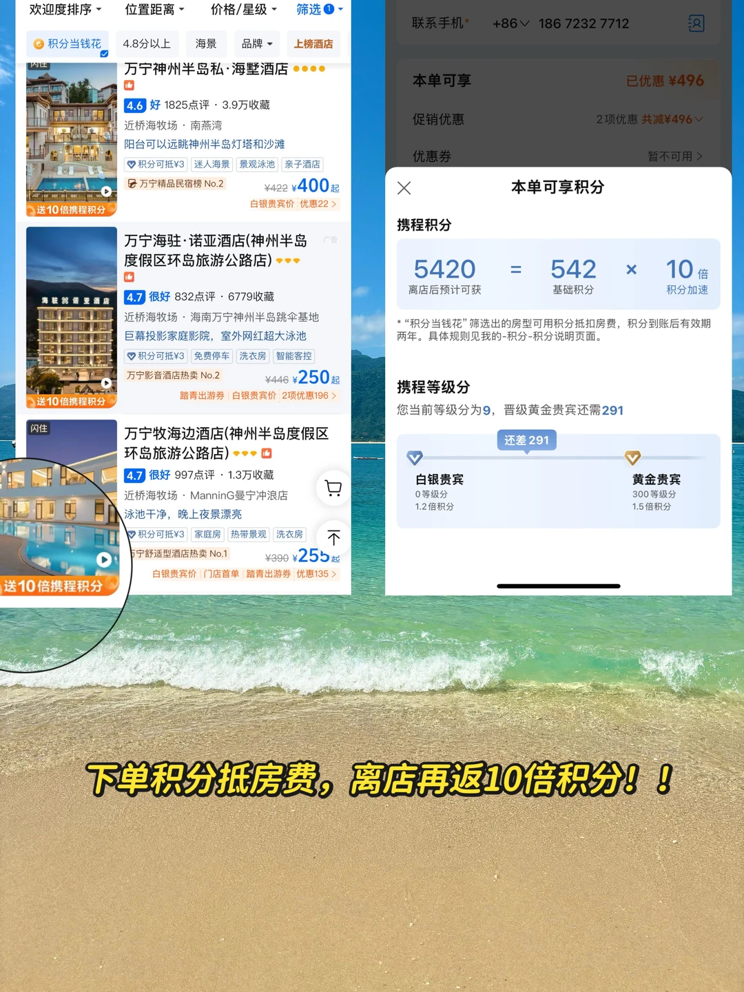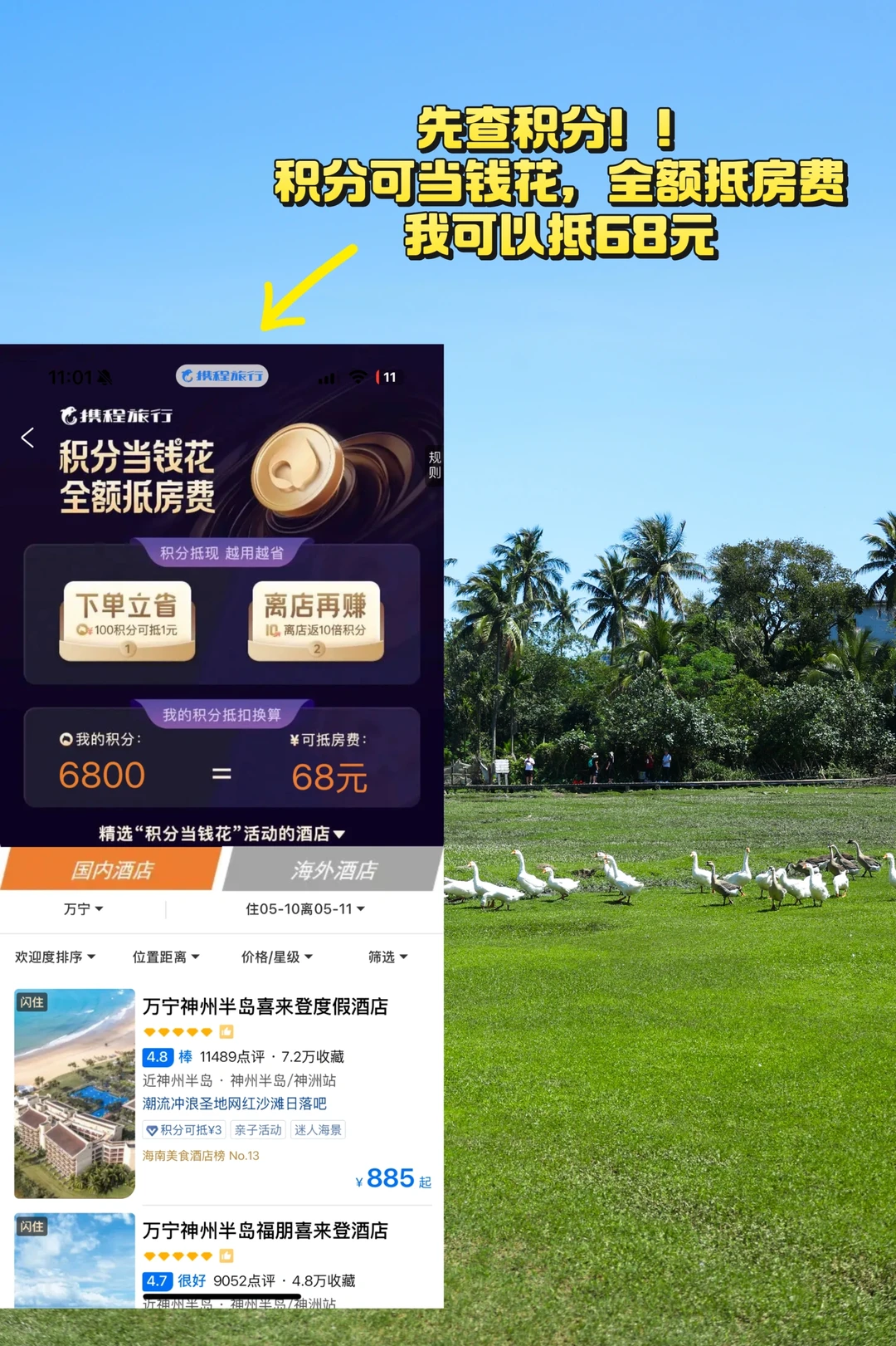 这次五一小长假又又又来万宁玩啦!! 五月份的万宁温度合适,海边风景超美的🌊 万宁不大,但每个地方都小众绝美 整理了9️⃣个打卡机位和地方🏖️ 大家码住再出发🛫 - ⭐️值得去的9️⃣个地方: 1️⃣山海浪人 山海浪人在新群湾,未经开发的小众海湾,10分钟上山顶可以俯瞰整个新群湾,也可以坐在海边的看玻璃海 2️⃣太阳河景观大桥 三面环海的沙滩🏝️,从大桥上往下拍很美!拍完还可以去沙滩捡贝壳 3️⃣桥海牧场🦢 天然的🆓牧场,小朋友可以喂大鹅,看牛羊,晴天的这里大草坪和栈道美像一幅画🖼️ 4️⃣海门椰坊 很喜欢老板在门口堆的椰子🥥,对面还有一家也很出片,还能和海边同框 5️⃣分界洲岛🐠 日月湾很近,打车13分钟,岛上有绝美的玻璃海,登到山顶🈶被震撼,带娃可以去海洋剧场,看海豚🐬海狮🦭、喂海龟🐢、喂魔鬼鱼等 6️⃣海狼日记 面朝大海的咖啡店☕️,还有海边秋千,记得晴天的时候来,可以看到不一样的海景 7️⃣神洲半岛 这里的沙滩🏖️敲出片!还有海边秋千、绝美的海边日落都在这里🌇 8️⃣科罗娜日落吧 就在酒店的沙滩上,这里的日落在万宁一绝 9️⃣MARTINI 有种小加州的感觉,红白条纹的元素+灯牌,很难不爱❤️ - 🏠关于住宿: 这次住宿是五一前在携程上就订好的日月湾旁的阿黎卡民宿,平时出去旅游都是用携程提前订酒店包括身边的朋友们也是,但很多人不知道!其实它超多羊毛可以薅‼️ ✔️比方说积分可以当钱花‼️100积分抵1元,筛选标签直接抵扣房费,订房立减,每次订酒店都能提前抵用,比如我这次,直接抵扣了68元 ✔️下单选择可以选择有“送10倍携程积分”标识的酒店!这次定的阿黎卡就🈶十倍积分,10倍积分留着下次订酒店用相当于返现啦! ✔️预订前可以先查看酒店权益,携程会员权益很多,比如兑换免费早餐🍳、免费升级房型、延迟退房到下午,出来度假当然要睡的舒服,这次用携程会员权益延迟退房,睡到自然醒不紧不慢的办理退房,给旅行增添了一份愉悦😁 - 订酒店用携程真香携程会员我觉得实用的会员权益万宁旅游万宁旅游攻略海南旅游海南美食万宁亲子游万宁神舟半岛万宁日月湾分界洲岛万宁小众打卡地万宁吃喝玩乐海边拍照万宁拍照