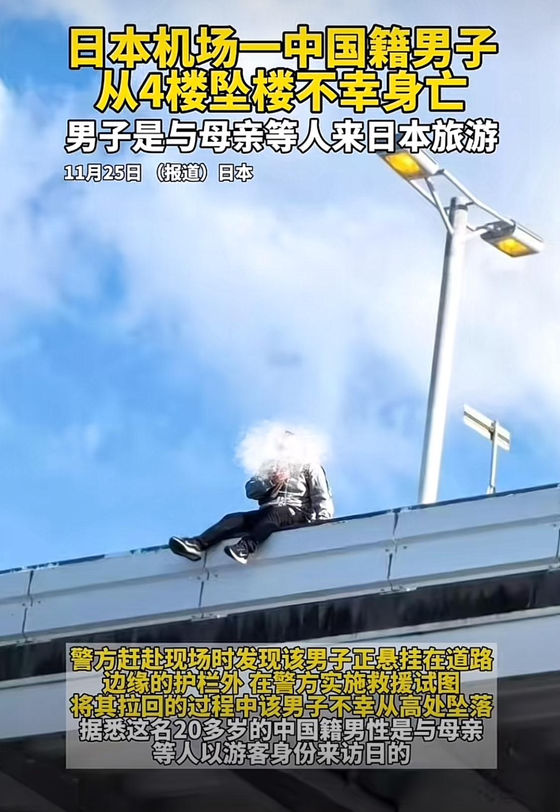 中国游客在日本机场坠亡,在这个时间节点,发生这样的事情,太蹊跷了! 从现场画面可以看到,事发前该男子坐在栏杆上,两名救援人员试图将他拉上来时,无奈双方体力不支,导致悲剧发生。 这要在平时,也就是一场意外事件。但在这个敏感时期,不免被冠以更多看法。 许多人都在评论,去哪里不好非要去日本。日本警察根本没有尽全力救人。下面怎么没有铺垫子。 大家的心情可以理解,但是事发突然,加上语言不通,确实很难做更多准备,大家还是理性一点。