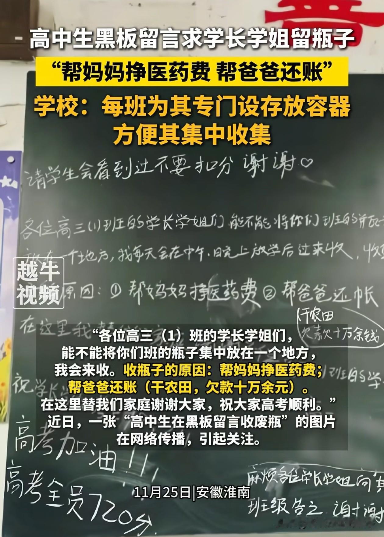 这个孩子懂事得让人心疼!近日,安徽淮南第五中学的一名学生,在每个教室的黑板上都写了一段话,希望学长学姐能把喝完水的瓶子集中放在一个地方。 他放学后会来把瓶子收走,并请求学生会如果看到了,能不能不要扣他学分。 这位同学这样做的目的,只是想凭他的努力给家里减轻一点负担,因为他妈妈生病了需要治疗,医药费是笔很大的开销,爸爸干农田还欠了账。 加上他上学也要花钱,所以就利用放学时间在学校里捡水瓶子卖钱补贴家用。 学校在了解他的家庭情况后,专门在每个班上都设立了存放瓶子的容器,方便他放学后去收走。 有人说学校为什不需要捐款,但我挺支持学校的做法,因为授人以鱼不如授人以渔,让他用自己的努力去赚钱,也给他保留了自尊,如果靠别人接济久了他会自卑,也有可能产生依赖,反而不好! 您觉得呢?