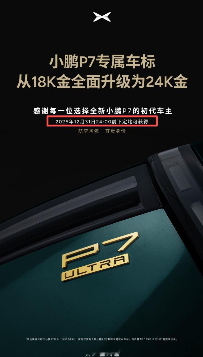 现在都在玩车标了啊?小鹏P7也将专属车标免费从18K金升级为24K金了。