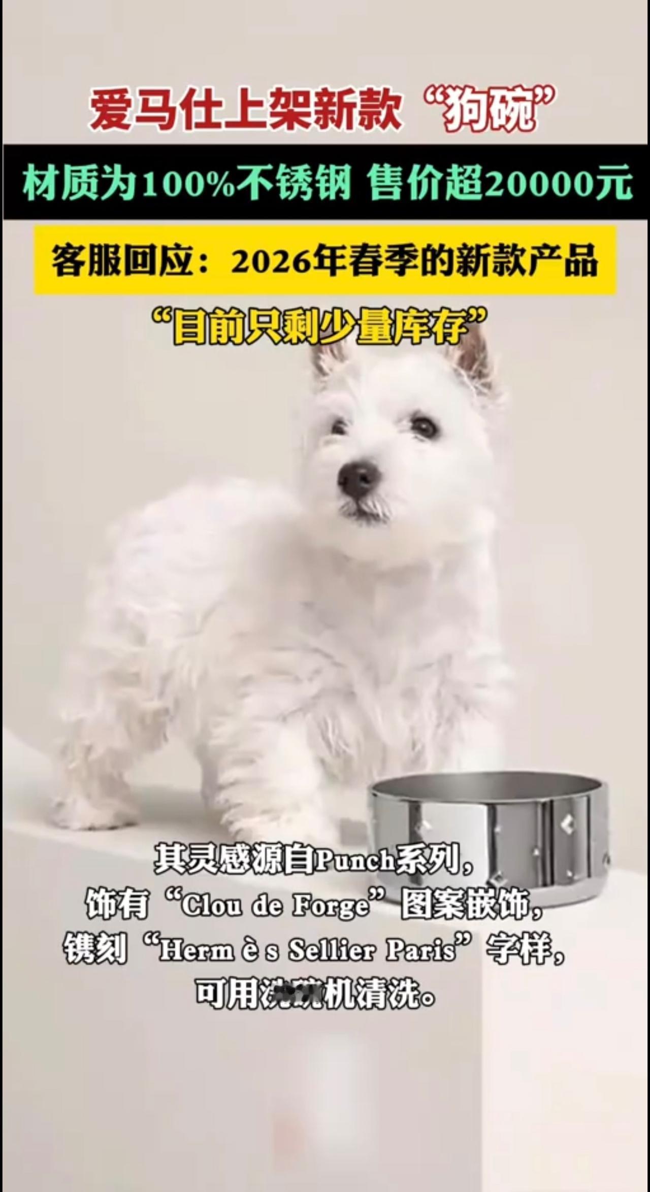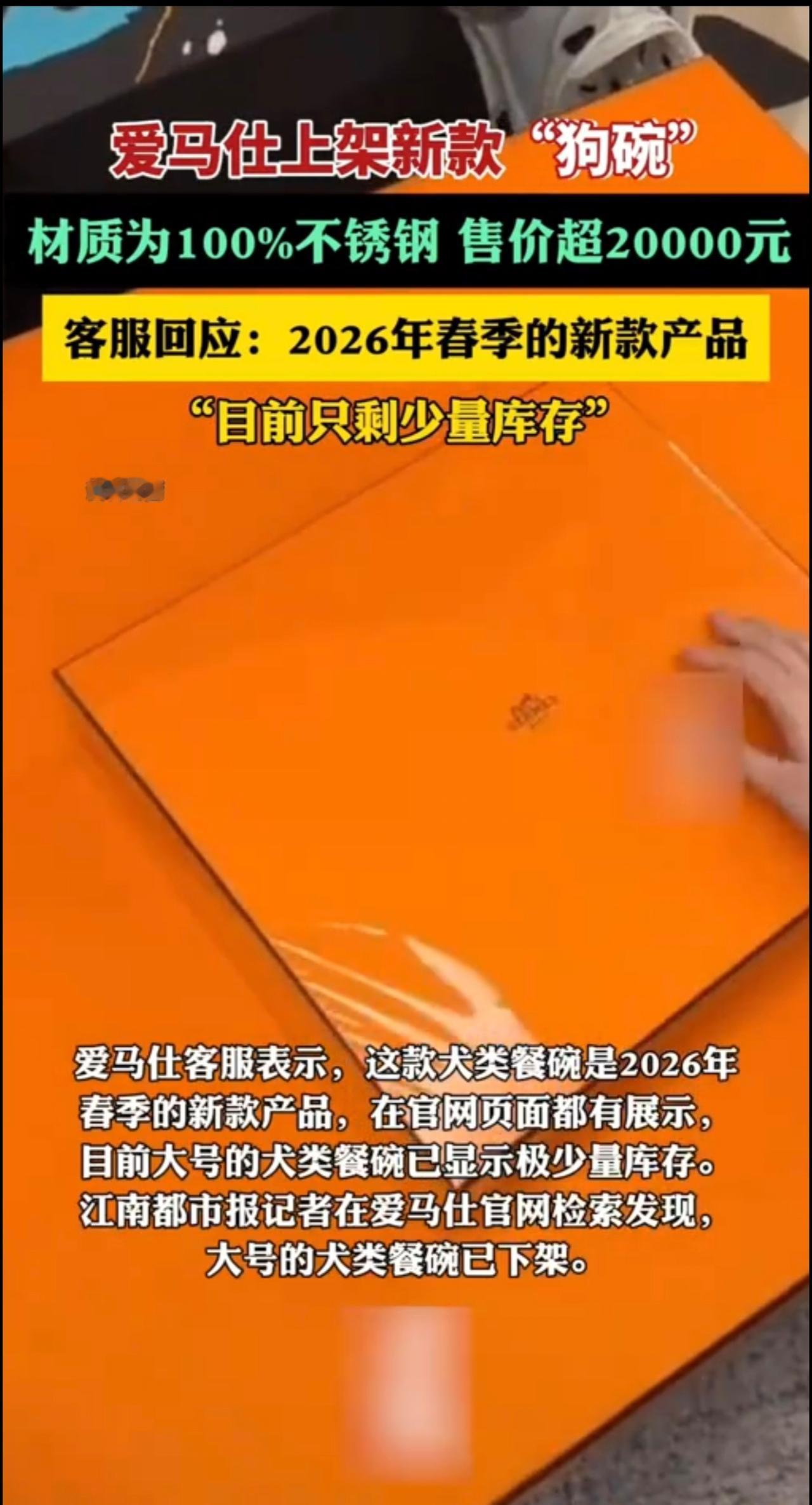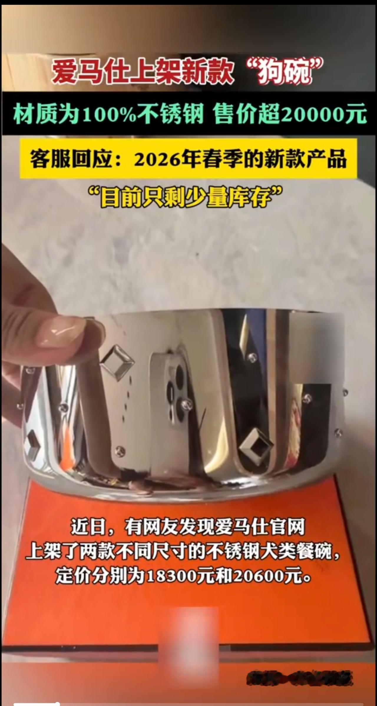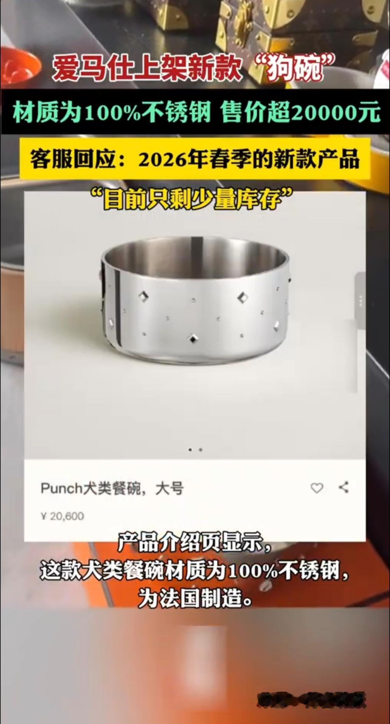 爱马仕上架新款“狗碗” 材质为100% 不锈钢 售价超20000元 客服回应: 2026年春季的新款产品 “目前只剩少量库存*”