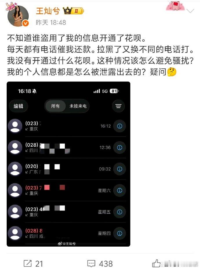 王灿兮透露催债电话是因为号码二次销售,联系支付宝后快速处理,终结电话轰炸,还暖心致谢网友们的支招~