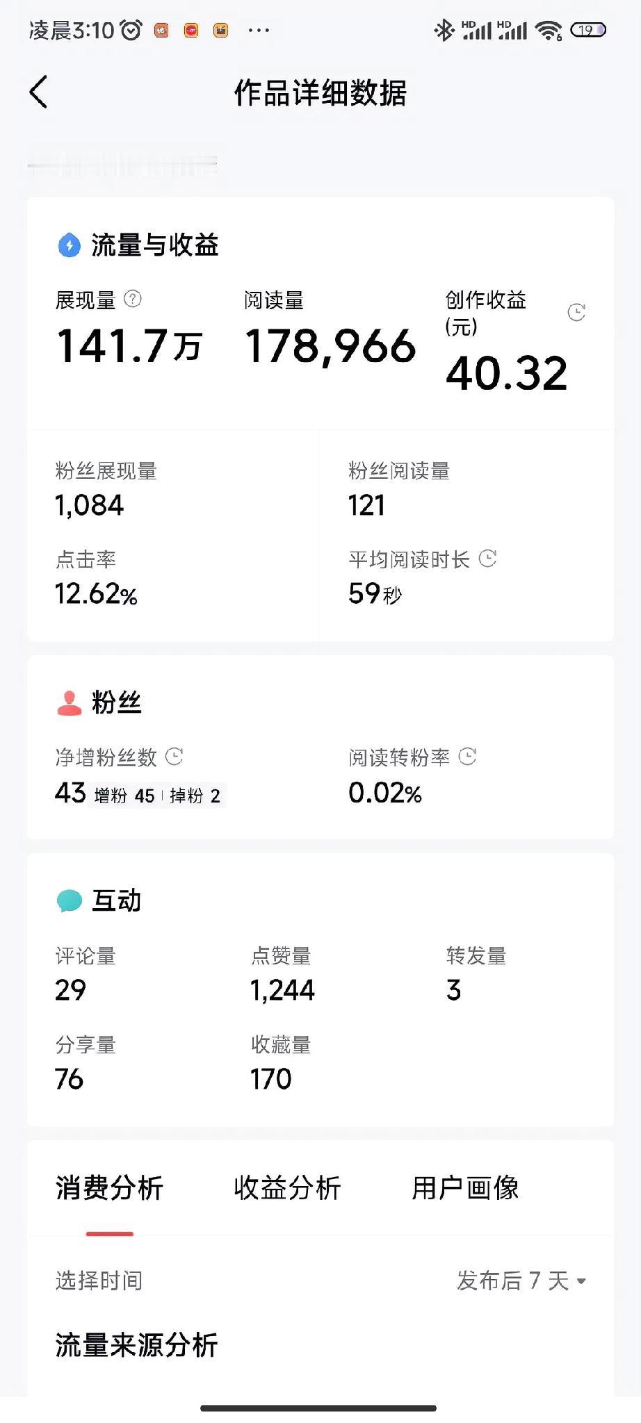 创作训练营2期开营啦阅读量178966,收益只有40.32,我大概就是收益最少的了吧,平均单价才2毛多一点,以前的爆款文章一般推流一天就不推了,但是这篇文章推流推了4天。这个让我有点小惊喜。不知道你们有没有这个感觉,每次爆款之后在写文章时阅读量很少。所以呢还是早以平常心来对待,用心创作每一篇文章。继续加油。