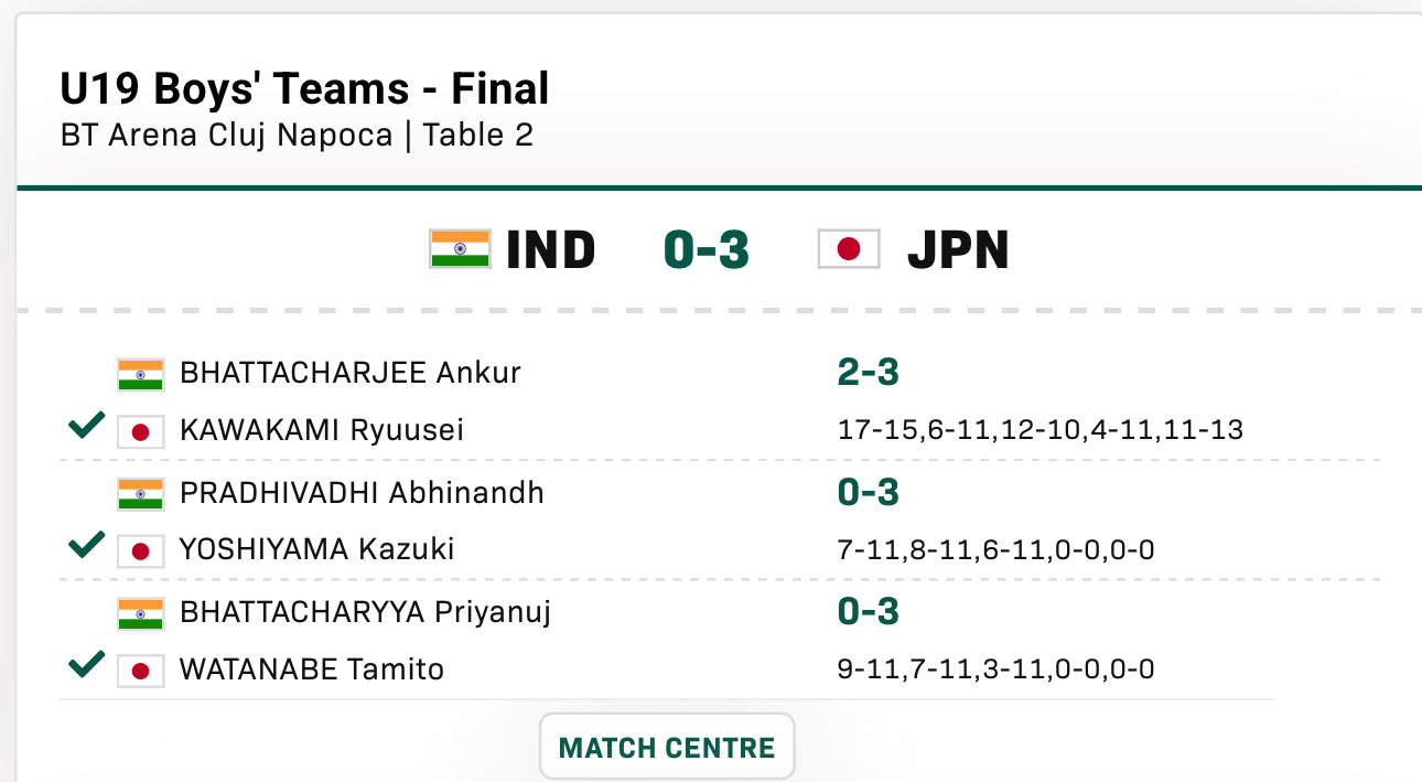2025世青赛U19男团决赛印度0-3日本安库尔2-3川上流星普拉迪瓦迪0-3吉山和希巴塔查拉亚0-3渡部名人日本队这把真是 也不能说“捡到了”但是确实是“螳螂捕蝉 黄雀在后”😃