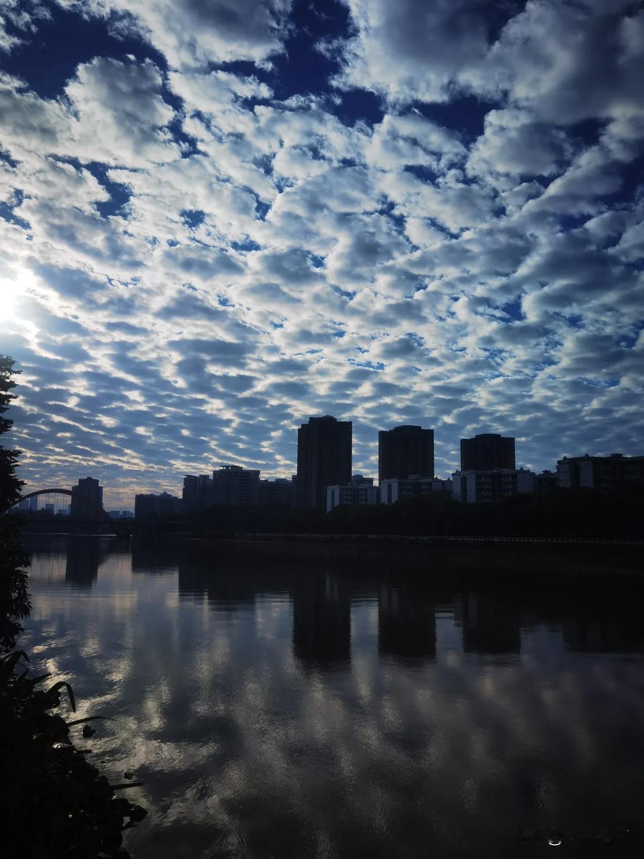 分享一张有关天空的照片晨光初现,鱼繗云层层叠叠甚是好看,江水清澈见底,平静如镜,晨跑的人们已经动起来了[比心]