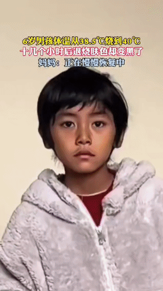 近日,湖南衡阳一位妈妈分享了6岁儿子的经历:孩子先是发烧,体温从38.5℃一路升到40℃,吃退烧药效果不好,家长赶紧带他去医院打了退烧针。 十几个小时后孩子退了烧,可家人却发现他的肤色明显变黑了。妈妈陆女士说,目前孩子正在慢慢恢复中,也让不少网友想起了身边类似的情况。 希望孩子能快快恢复原本的模样,也提醒大家遇到孩子高烧不退的情况,一定要及时就医,别慌也别大意,平安比什么都重要。孩子发烧 娃发烧经历