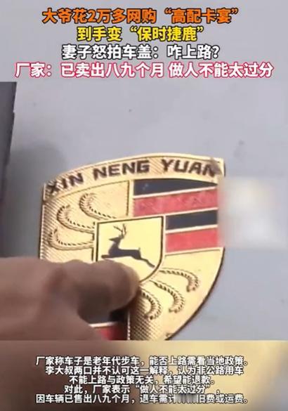 贪小便宜吃大亏!河南一大爷花23000元网购“高配卡宴”,结果到手之后,发现车标上印着鹿,“保时捷”也变成了“保时捷鹿”,是妥妥的山赛车,而且,根本不能上路,希望厂家能退款,厂家喊冤:已卖出八九个月,做人不能太过分。 大爷平时就爱逛个网购APP捡实惠,前段时间刷手机时,一条广告“哐当”撞进眼里——“高配卡宴清仓,仅售23000元”,还配着保时捷卡宴的高清图。 老李眼睛都看直了:听说卡宴得百八十万,这才两万三,就算是二手残次品也值啊!他连跟老伴商量都没商量,手指头一点就付了钱,等着“豪车”上门。 等物流车把“豪车”拉到小区,老李搓着手凑过去一看,当场就懵了。 再摸车身,缝隙大得能塞进去手指头,车门关着都漏风,塑料件一按就软塌塌的,明摆着是小作坊拼的杂牌车。老伴凑过来一看,气得一屁股坐在车头拍着盖子喊:“这咋上路!牌照都上不了!” 大爷也是吃了没文化的亏,知道保时捷是豪车,就没怀疑过为啥这么便宜?知道保时捷这个品牌,却不认识车标?保时捷车标上有一匹跃马,而大爷买的车子,车标中间是一头鹿! 保时捷上的字母是PORSCHE,而大爷买的车英文是XIN NENG YUAN,简称新能源! 厂家解释,车子是老年代步车,能否上路需看当地政策。 李大爷两口并不认可,认为非公路用车,不能上路与政策无关,希望能退款。 对此,广家表示,“做人不能太过分”。因车辆已售出八九个月,退车需计算折旧费或运费。 根据《消费者权益保护法》第55条,卖家用“高配卡宴”的虚假宣传误导消费,还卖“三无产品”(无厂名、无厂址、无合格证明),不仅得全额退款,还得按价款三倍赔偿。 目前,双方已达成一致。厂家已将车款全额退还给李大叔。 有网友表示:“2万买卡宴?这不是贪小便宜,是揣着侥幸想捡漏,没被坑得倾家荡产算烧高香了!” 还有网友说:“我妈上次差点买1千的‘劳力士手表’,说是清仓,我一看塑料表盘就给拦了,老年人就吃‘低价名牌’这套!” 一分钱一分货的理儿,老祖宗传了几百年了!百来万的车卖两万多,用脚指头想都知道有猫腻,这不是捡便宜,是往骗子挖的坑里跳啊!其实老李的心思,不少老年人都有——要么想花小钱装面子,要么觉得“网购能捡漏”,却忘了商家比猴还精,“低价名牌”四个字,本身就是陷阱的幌子。 有人说老李糊涂,可换个角度想,骗子的套路太精准了。 广告里配着真卡宴的图,标题里加“高配”“二销”这些看似正规的词,再标个极低的价格,精准戳中老年人“爱实惠、盼面子”的心理。 但话说回来,贪念才是最害人的——要是老李没抱着“花两万买百万豪车”的幻想,多跟老伴商量一句,或者找懂车的年轻人看看,也不会掉进圈套。就像村里老话说的“人心不足蛇吞象”,不切实际的期待,迟早会变成坑自己的陷阱。 大爷花2万多网购高配卡宴变保时捷鹿