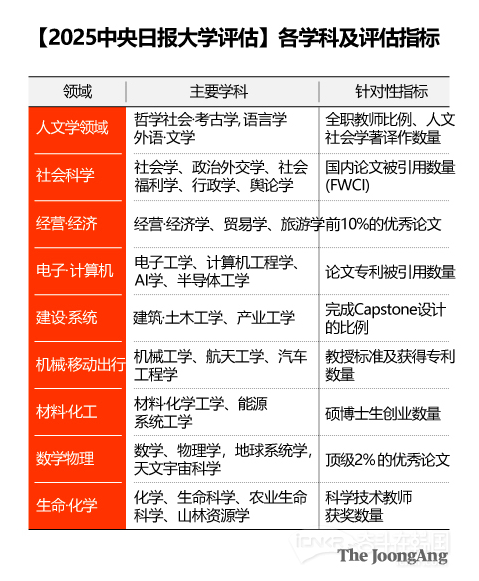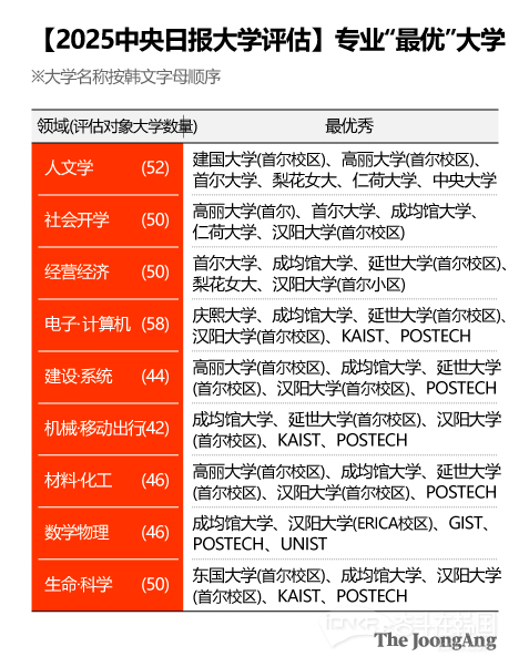 【2025韩国本土大学专业评估出炉】 在韩国《中央日报》今年实施的学科领域大学评估中,首尔大学在人文、社会科学、经营经济3个领域获得“最优”评价,成均馆大学和浦项工科大学(POSTECH)则在工学与自然科学6个领域全部获评“最优”,展现出强大的研究与教育实力。延世大学(首尔校区)、汉阳大学(首尔校区)在工学四大领域获得“最优”评价,高丽大学(首尔校区)、韩国科学技术院(KAIST)、仁荷大学等高校在多个学科领域也展现出竞争力。9项学科领域首次实施大学评估此次正逢《中央日报》创刊60周年之际首次实施“学科领域大学评估”,旨在直接对比各高校在不同专业与学科门类中的具体表现。评估涵盖人文学、社会科学、经营经济、电子与计算机、材料与化工、机械与机动、建设与系统、数学与物理、生命与化学共9个领域,由专家顾问委员会根据学术与产业的重要性、研究与教育的关联性等指标综合评定。与以往中央日报大学综合评估不同,此次更侧重于各专业的研究与教育成果,而非学校声誉或财政条件,并针对学科特点制定不同的评估指标与权重。最终将前10%的高校评定为“最优”,前30%为“优秀”,并通过报刊公开发布。中央大学研究生院院长、社会科学顾问委员金二敬表示,“此次评估展现了各高校在细分学科上的研究与教育质量优势,不仅为学生与家长提供参考,也有助于高校制定特色化与发展战略”。此次评估未涉及医学、法学、艺术体育等领域。在人文、社会、经营经济三大领域中,即便面临人文学科危机,仍有部分大学通过强化基础学科投入,或顺应社会变化进行研究与教育创新,从而获高度评价。首尔大学在人文学科的专任教师配备率、自筹研究经费、毕业生就业率等核心指标中表现突出,成为该领域最优大学。建国大学(首尔)因开展“机动人文学”等融合科技与产业的研究,仁荷大学则通过“K-人文学”等项目扩展韩国学的国际影响力,两校亦获评人文学科最优大学。在经营经济领域,梨花女子大学以72.3%的就业率(第2位)及1.3%的低辍学率(第2位)等优异教育成果跻身最优大学之列。延世大、汉阳大工学全领域获得“最优”在工学领域,国际联合研究与技术转让成果成为评定最优大学的关键指标。汉阳大学(首尔校区)在4个工学领域中获得最优评价,凭借强大的研究能力在技术转让方面表现突出。该校近三年技术转让收益约为393.59亿韩元,约为被评估67所大学平均值(约44.39亿韩元)的9倍。韩国科学技术院(KAIST)在电子与计算机领域的论文专利被引用次数达386次,比评估大学平均值(44次)高出8倍。论文专利引用数反映的是研究成果在产业界的实际应用程度。在自然科学领域,大学的基础科研持续投资以及“前2%优秀论文”等质量指标成为评价依据。蔚山科学技术院(UNIST)在数学与物理领域中每位教授在国际学术期刊上的论文被引次数最多,获评最优。汉阳大学(ERICA校区)在“前2%优秀论文”排名第3,学生实习参与率位居第1,也因此获得高度评价。成均馆在9项学术领域中8项获得“最优”成均馆大学在9个学科领域中,有8项获得“最优”评价,成为本次评估中获得最优评价最多的高校。该校不仅研究质量高,在创业与就业等学生教育指标方面亦表现均衡。在此次评估中,首尔大学虽然在工学与自然科学领域的外部研究经费、专利成果方面表现优异,但在“前2%论文”、国际合作论文、创业型研究生与实习学生比例等指标上则相对逊色。在地方核心国立大学中,庆北大学与釜山大学在人文与经营经济领域获得“优秀”,忠南大学则在人文与社会科学领域获评“优秀”。