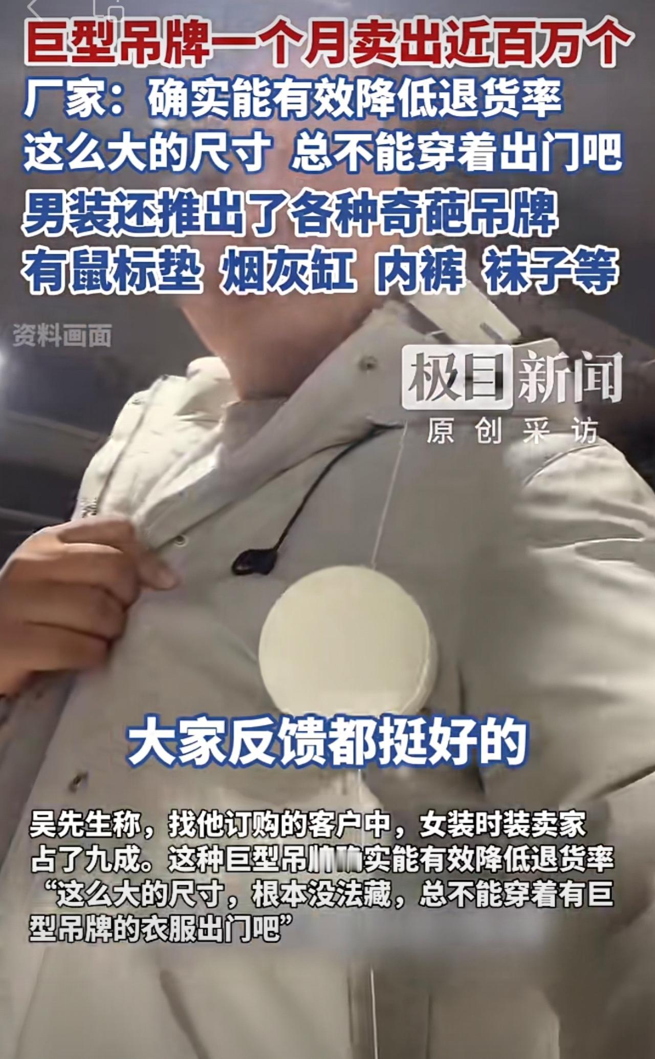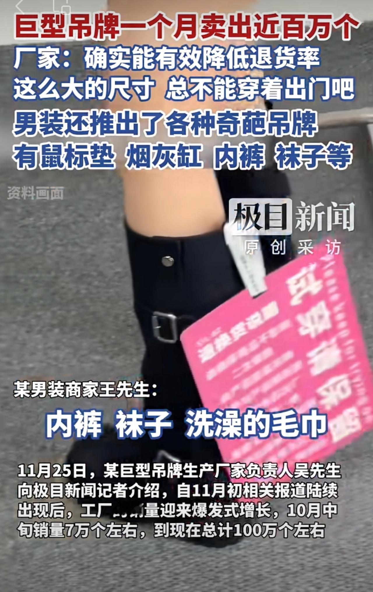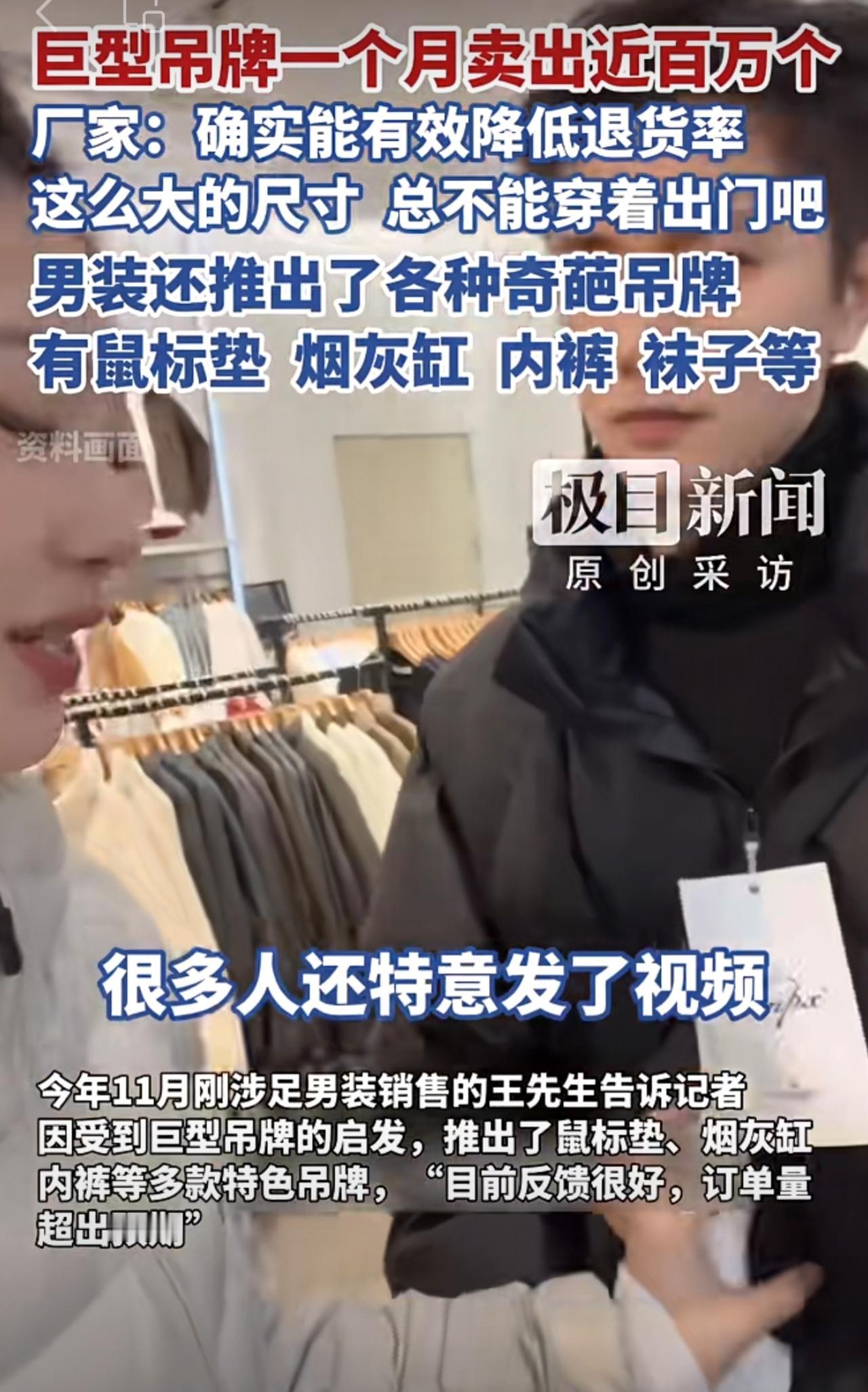 厂家称巨型吊牌销量翻了十几倍,一个月卖出近百万个,男装还推出了如鼠标垫、烟灰缸、内裤等各种奇葩吊牌。