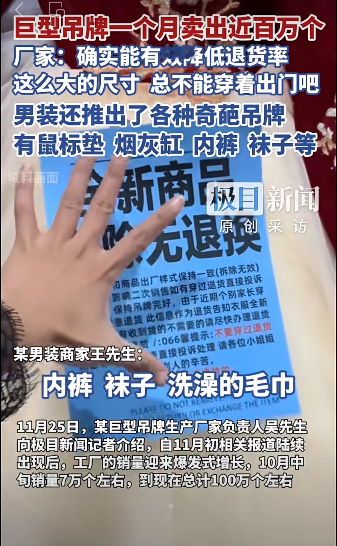 厂家称巨型吊牌销量翻了十几倍,一个月卖出近百万个,男装还推出了如鼠标垫、烟灰缸、