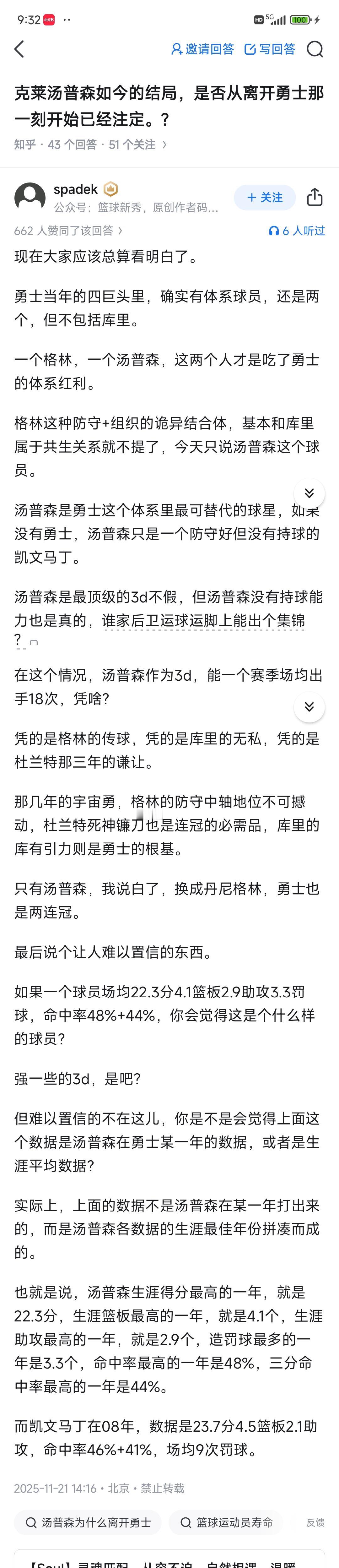 现在汤普森不行了,有人趁机说他是体系球员? 勇士王朝四大巨星,库里,杜兰特都牛逼。 就汤普森和格林是体系,离开勇士完蛋? 我认为不对,汤普森现在老了,还有很多伤病,所以在独行侠打得非常差。 汤普森是1990年出生,今年35岁了,乔丹,科比在这个年纪都是老将快退役。 不能按照詹姆斯的标准,如果汤普森25岁去独行侠,至少也是主力球员吧![思考]