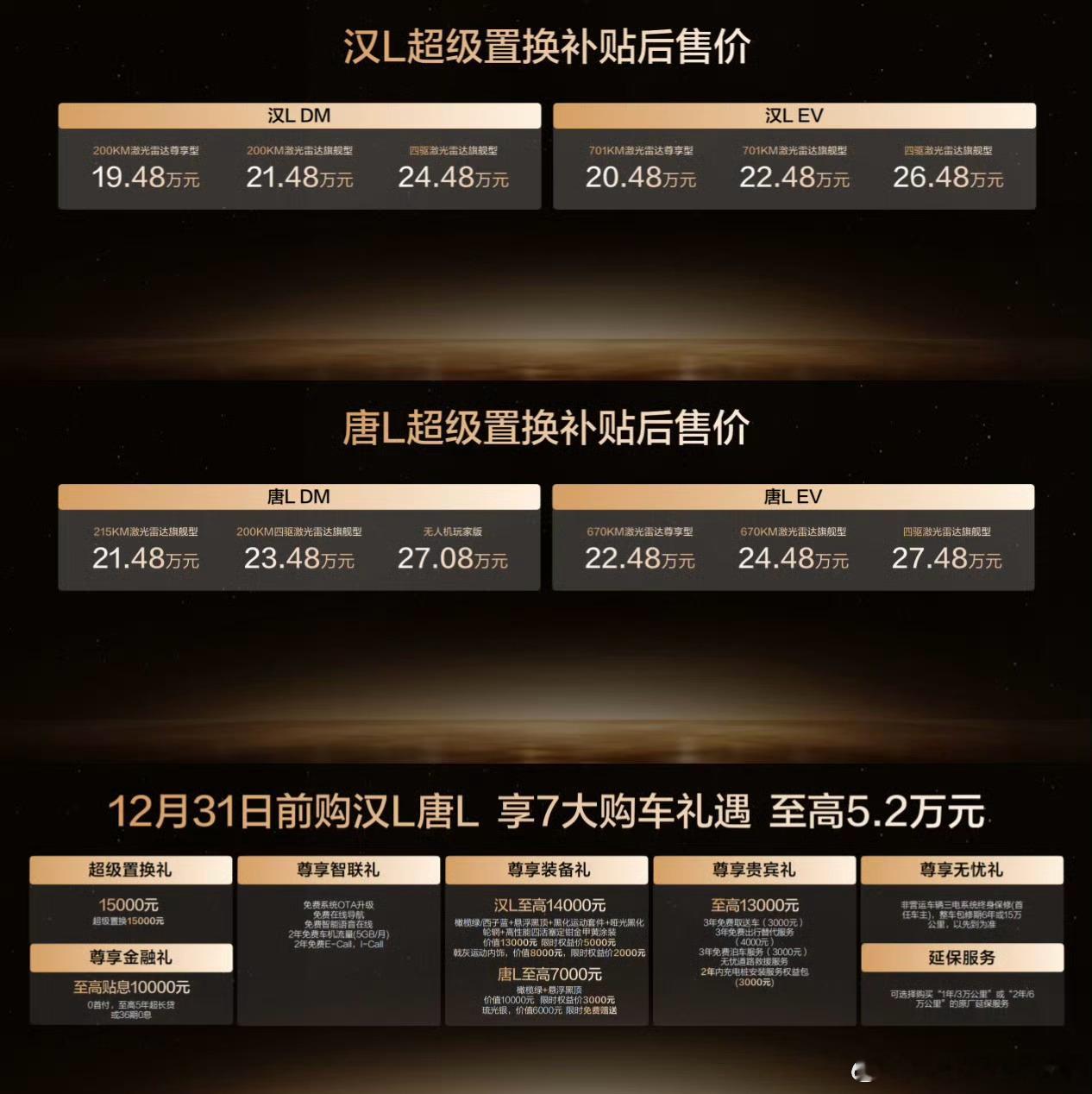 本届广州车展比亚迪对普通消费者价值最大的其实是汉L和唐L的升级第一个是车漆和内饰的新增,汉L和唐L都各自新增了两款很有辨识度的车漆,汉L还增加了运动风格内饰,比亚迪已经开启6+3模式,未来高端化车型应该是8+4(8种车漆,4种内饰)第二是智能化的跃迁,天神之眼B开启车位到车位的推送,DiLink 150的UI全面焕新,车位到车位本周去试驾,全新UI真的很好看很好用,绝对的行业前列第三是生态,除了钛7首发的车内设备,现在比亚迪开始将“人-车-家”进行互联,与美的合作的生态可以实现车控家或者家控车,把智能化的边界拓展到更宽这些点就是比亚迪车型未来一段时间的升级方向,更丰富的颜色选择,更智能的辅助驾驶和车机,更广泛的生态互联,随便拿一项开启全民化最后还有一个1.5w的超级置换补贴,很容易拿,理解为直降1.5w就行了,汉L最低的指导价已经来到19.48w入手的门槛进一步降低
