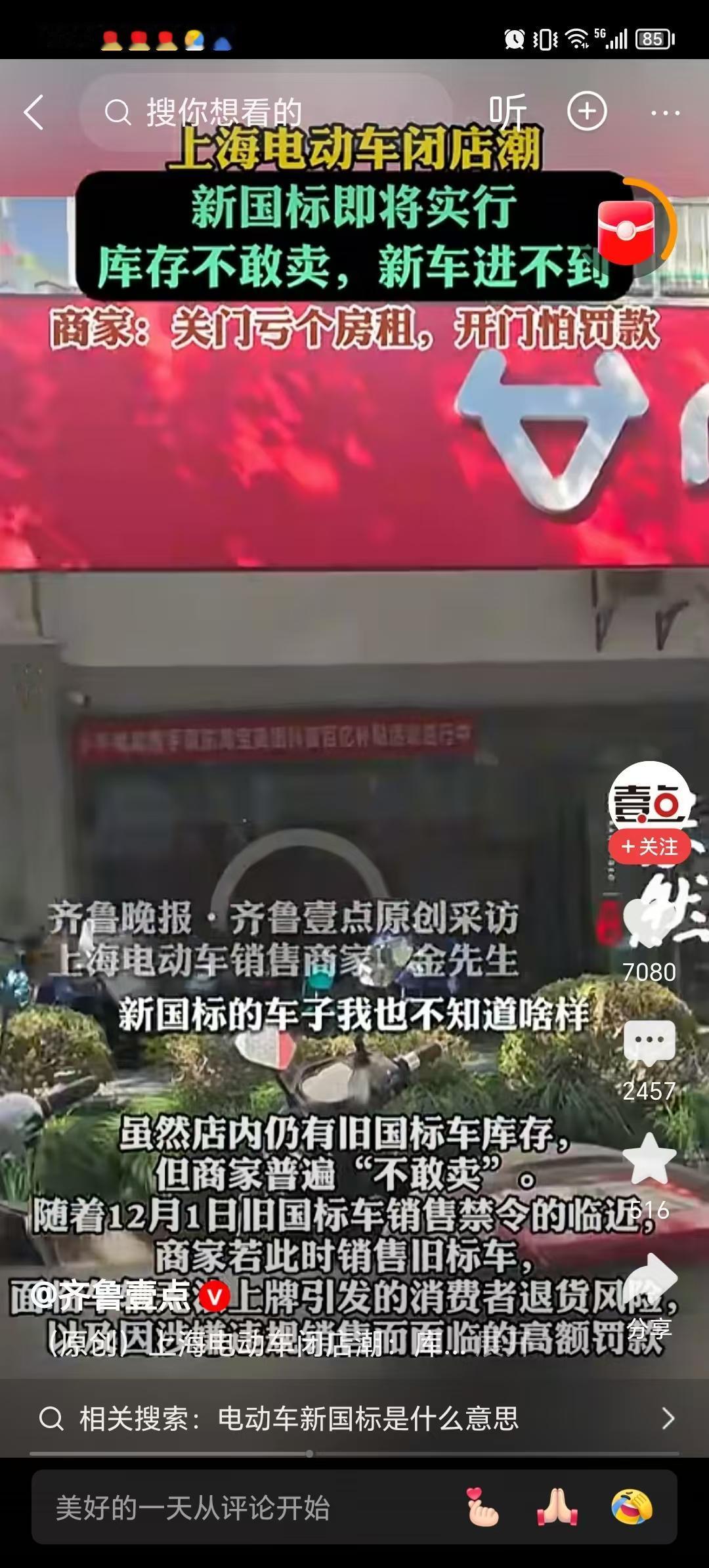 刷到这个视频,直接给我看懵住了! 上海电动车闭店了,全上海几乎都关了电动车店铺!新日,爱玛,雅迪,小牛,九号等知名品牌! 关店时间已经持续一个星期了,老板说关门的话只会退个房租,而开门卖电动车,说不定会罚款! 12月1日是新国标电动车即将实行!自家店里的库存旧国标车现在不敢卖!新国标车也进不到货! 一开始说好的是淘汰燃油车,燃油车没倒闭,反而电动车快倒闭了! 网友说,我们浙江这儿的电动车必须换绿牌,蓝牌都不行,没发票不能上路,三年以上电瓶车不给上路,逼着你换新!拿旧车,可以抵四五百元钱去换新国标,自己要掏至少2000块钱! 雅迪c08的车去年出的新国标2200元,现在出的新国标车,多了北斗定位2990元! 食品安全要是这样严格,才是王道! 电动车限制令 电瓶车上海上牌 上海新日电动车 新国标电动车 电动自行车新国标都有哪些要求? 上海实体店倒闭