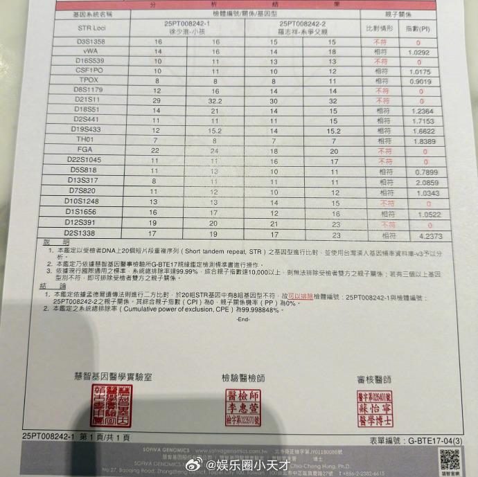 罗志祥经纪人晒亲子鉴定有人说罗志祥经纪人的小孩是罗志祥的亲生孩子,罗志祥经纪人小霜晒了亲子鉴定否认这一传闻。