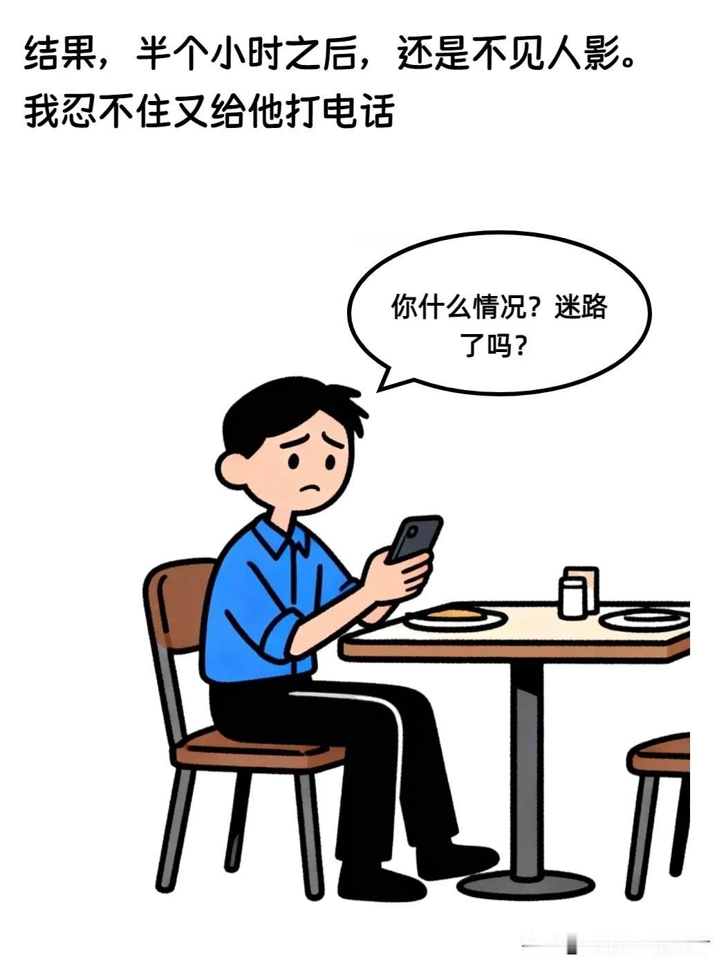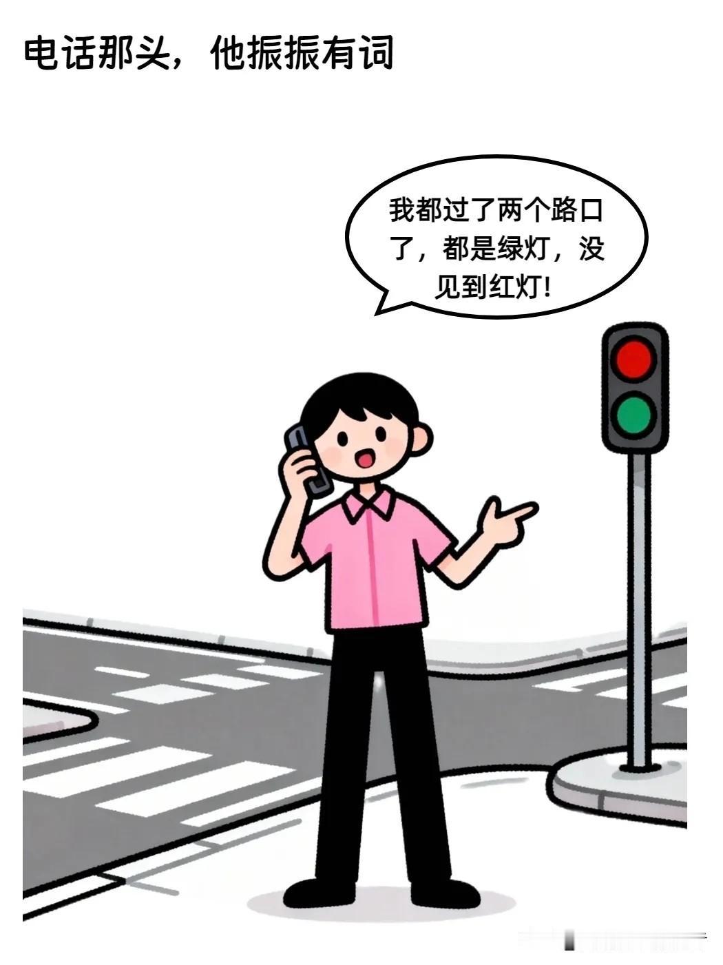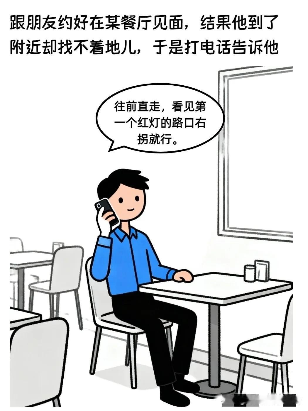 有趣漫画:跟一朋友约好在某餐厅见面,结果他到了附近却找不着地儿,于是告诉他:“往前直走,看见第一个红灯的路口右拐就行。"