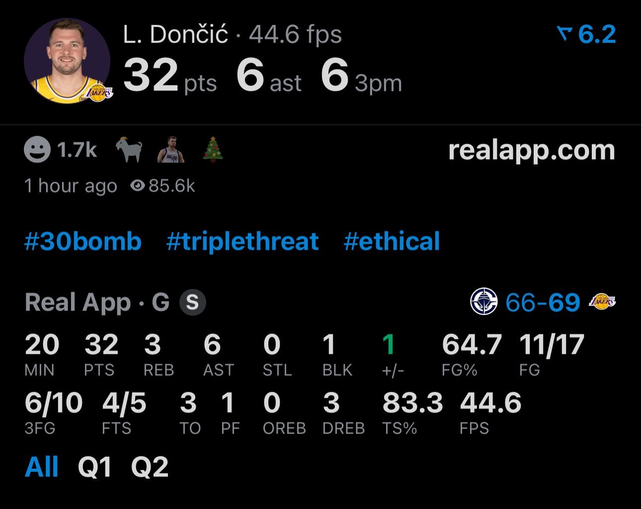 半场结束,东契奇32分3篮板6助攻,三分10中6洛城德比东契奇