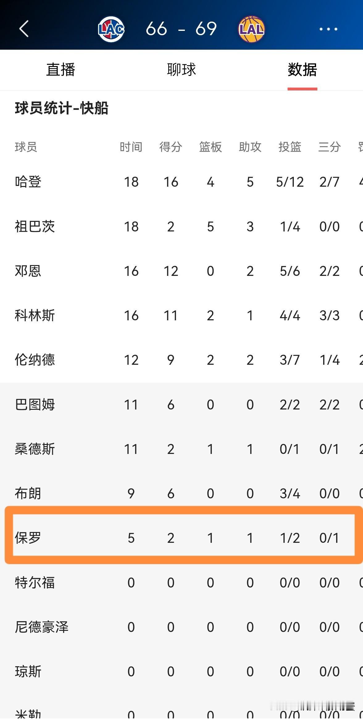 快船老将保罗彻底的沦为了陪衬!在今天快船客场挑战湖人的焦点战中,目前双方的上半场比赛已经结束,快船暂时以66:69落后于湖人。让人唏嘘不已的是,曾经洛杉矶德比战的绝对主角保罗彻底的沦为了一名看客。 在前两节比赛中,保罗替补出战5分钟,投篮2中1得到2分1篮板1助攻,他的场上正负值为-5。 这真是岁月不饶人,如今的保罗再也不是当年那个在洛杉矶德比战叱咤风云的控卫之神了。