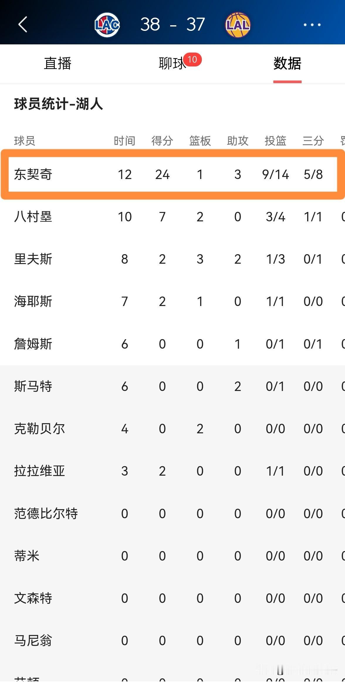 湖人超级巨星东契奇真是特别的过分!在今天湖人主场迎战快船的焦点战中,目前双方的第一节比赛已经结束,湖人暂时以37:38落后于对手。让人感到无比惊叹的是,东契奇在第一节比赛中首发出战12分钟,投篮14中9,其中三分球8中5、罚球2中1疯狂的砍下24分。 东契奇真是特别的过分,湖人全队在第一节比赛中才得到37分,而他自己就砍下24分,这让湖人的其他球员情何以堪?