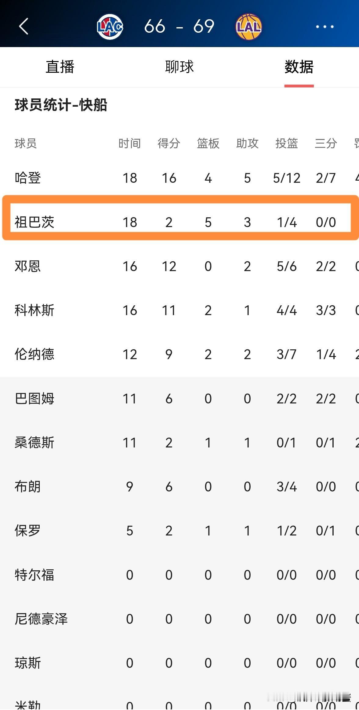 快船当家中锋祖巴茨真是太烂了!在今天快船客场挑战湖人的比赛中,目前双方半场战罢,快船以66:69落后于对手。在前两节比赛中,祖巴茨首发出战18分钟,投篮4中1仅仅得到2分,他的场上正负值为-4。 需要指出的是,本场比赛湖人当家中锋艾顿因伤缺阵,而祖巴茨在艾顿缺阵的情况下打得如此糟糕,真是让人大失所望。