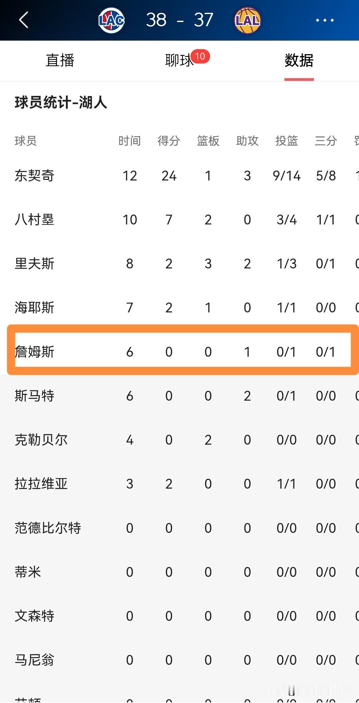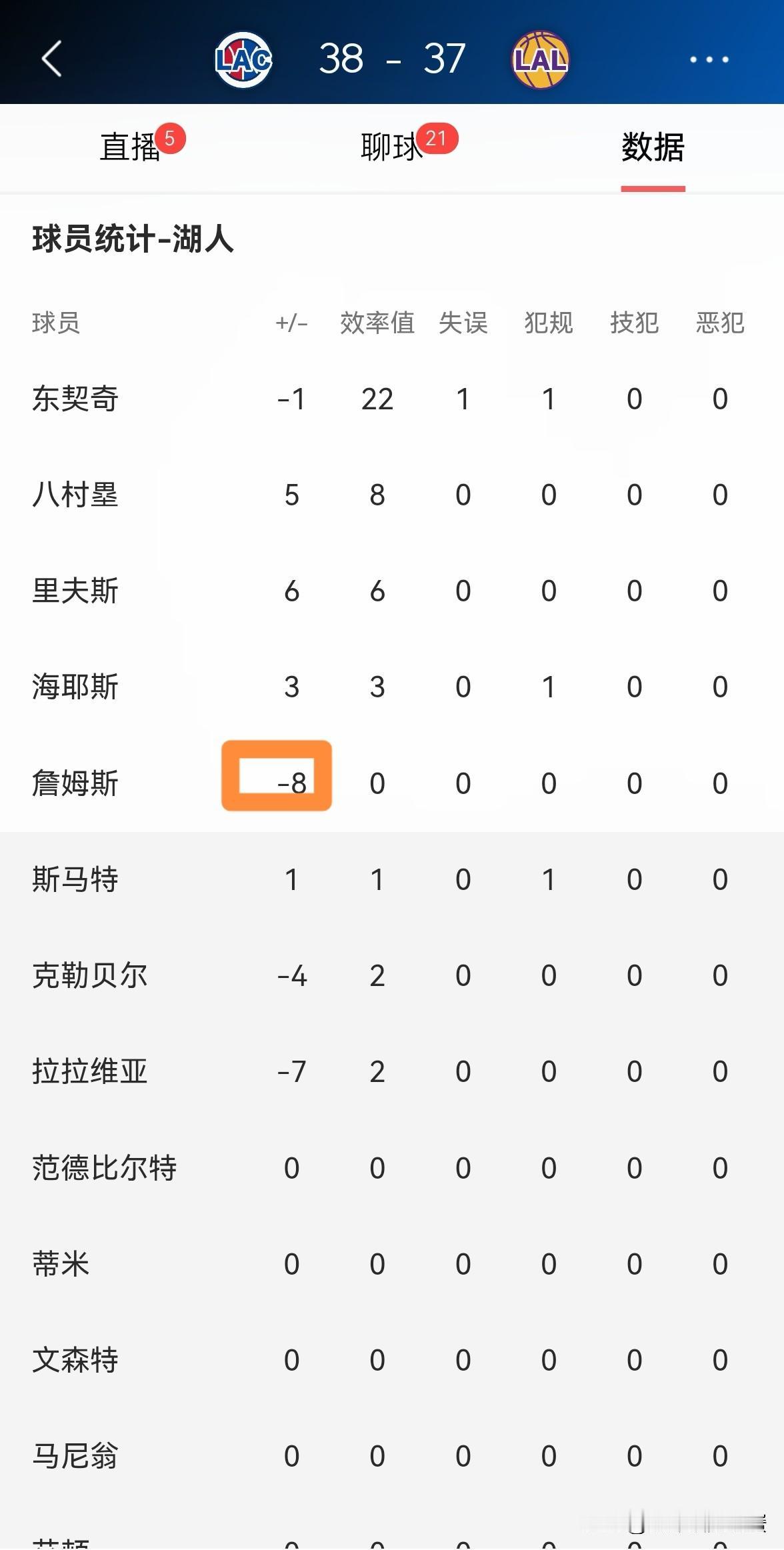 湖人超级巨星詹姆斯真是不可救药了!在今天湖人主场迎战快船的第一节比赛中,詹姆斯首发出战6分钟,投篮1中0怒砍0分,仅仅得到1助攻,他的场上正负值为全队最低的-8。 作为一名40岁的老将,我可以容忍他偶尔一场比赛正负值全队最低,但是我实在无法容忍他每场比赛场上正负值全队最低。