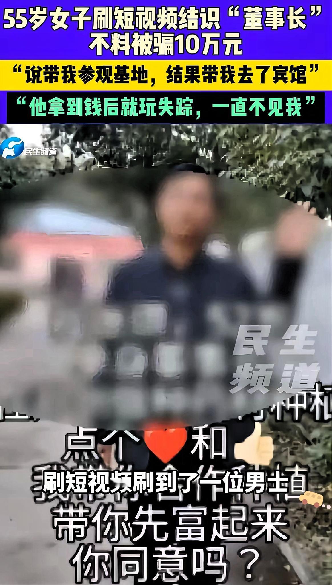 “董事长爱上快绝经的我”?河南55岁阿姨的黄昏恋,终究是一场骗财骗色的骗局! 刷短视频遇到豪车名表的“董事长”,对她嘘寒问暖,说就喜欢她的朴实真诚,还许诺让她当“董事长太太”。 阿姨彻底沦陷,不仅跟对方去宾馆“深入交流”,还心甘情愿转了10万“投资款”,连几百块的生日红包都眼不眨地发。 可钱一到账,“董事长”直接失联,只留下阿姨的血汗钱和破碎的美梦。这哪里是爱情,分明是骗子摸准了中年独居女性的情感缺口,量身定制的陷阱。 真正的爱情从不是天上掉馅饼,越是把“完美”挂在脸上,越要多留个心眼。所谓的“项目投资”“资金周转”,不过是骗钱的幌子。 黄昏恋值得期待,但防骗的底线不能丢。你身边有中老年人遇到过类似骗局吗?该怎么提醒长辈避开这类坑?来评论区聊聊~