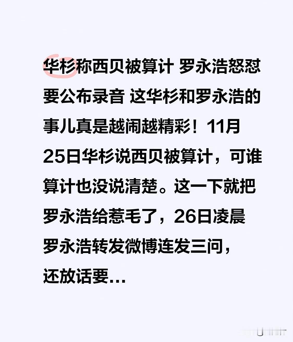 华杉称西贝被算计 罗永浩怒怼要公布录音 华杉称西贝被算计,罗永浩怒怼要公布录音,华杉与罗永浩的纷争愈发精彩!11月25日,华杉称西贝被算计,却未点明算计者。这惹恼了罗永浩,26日凌晨,罗永浩转发微博连发三问,还表示若说不清楚就公布录音。 此事早有渊源。9月,罗永浩吐槽西贝预制菜贵且难吃,贾国龙欲起诉他。后网友晒出西贝“堂食袋装”产品照片,贾国龙解释是已关闭品牌的库存。此前华杉还曾就罗永浩相关评论道歉,如今又生事端。不知录音里藏着什么,大家都在等华杉回应。 西贝现状 西贝现状 西贝餐厅事件 西贝直播翻车 西贝公开信