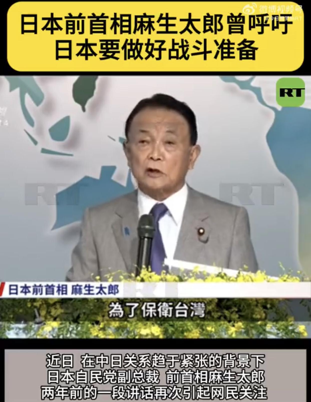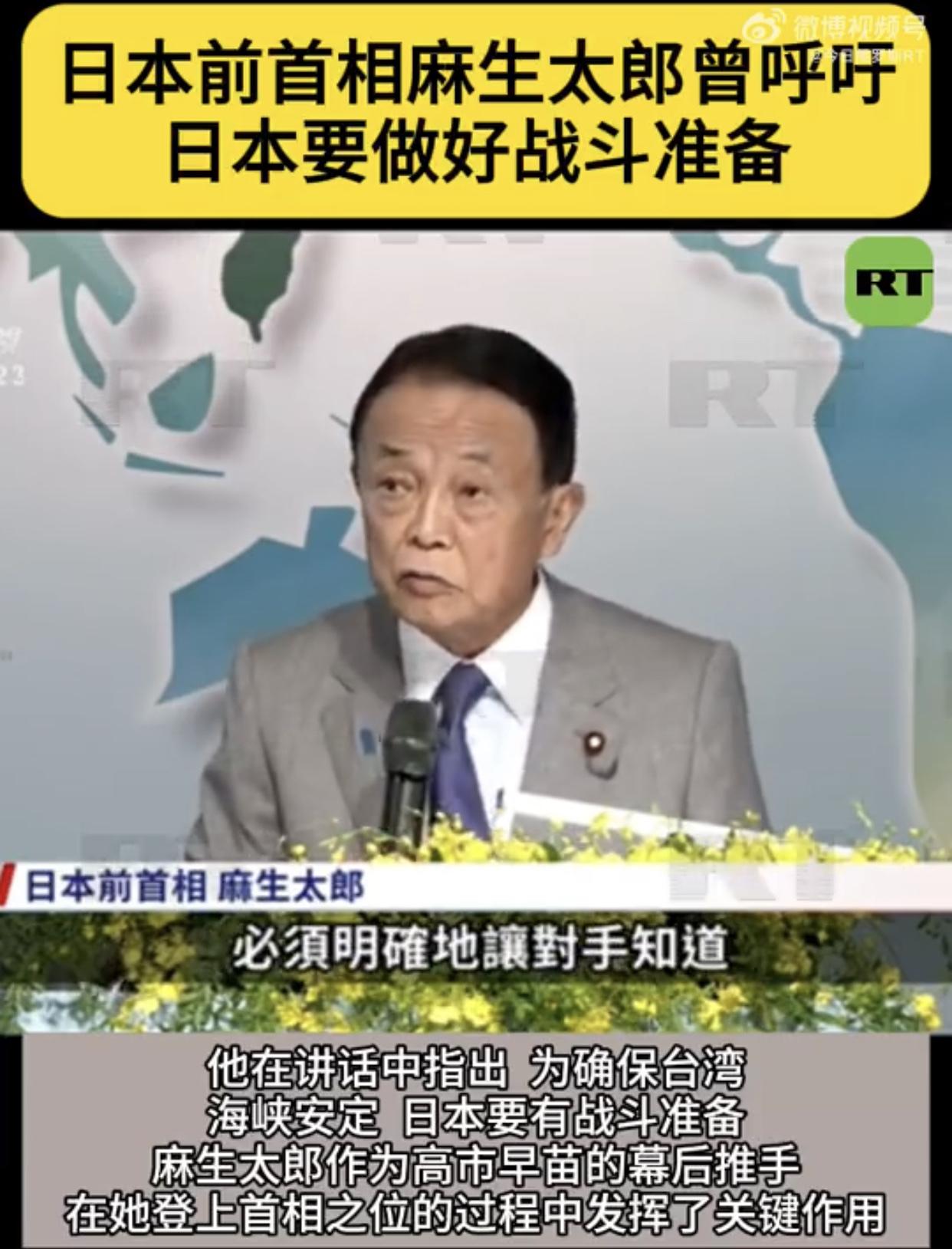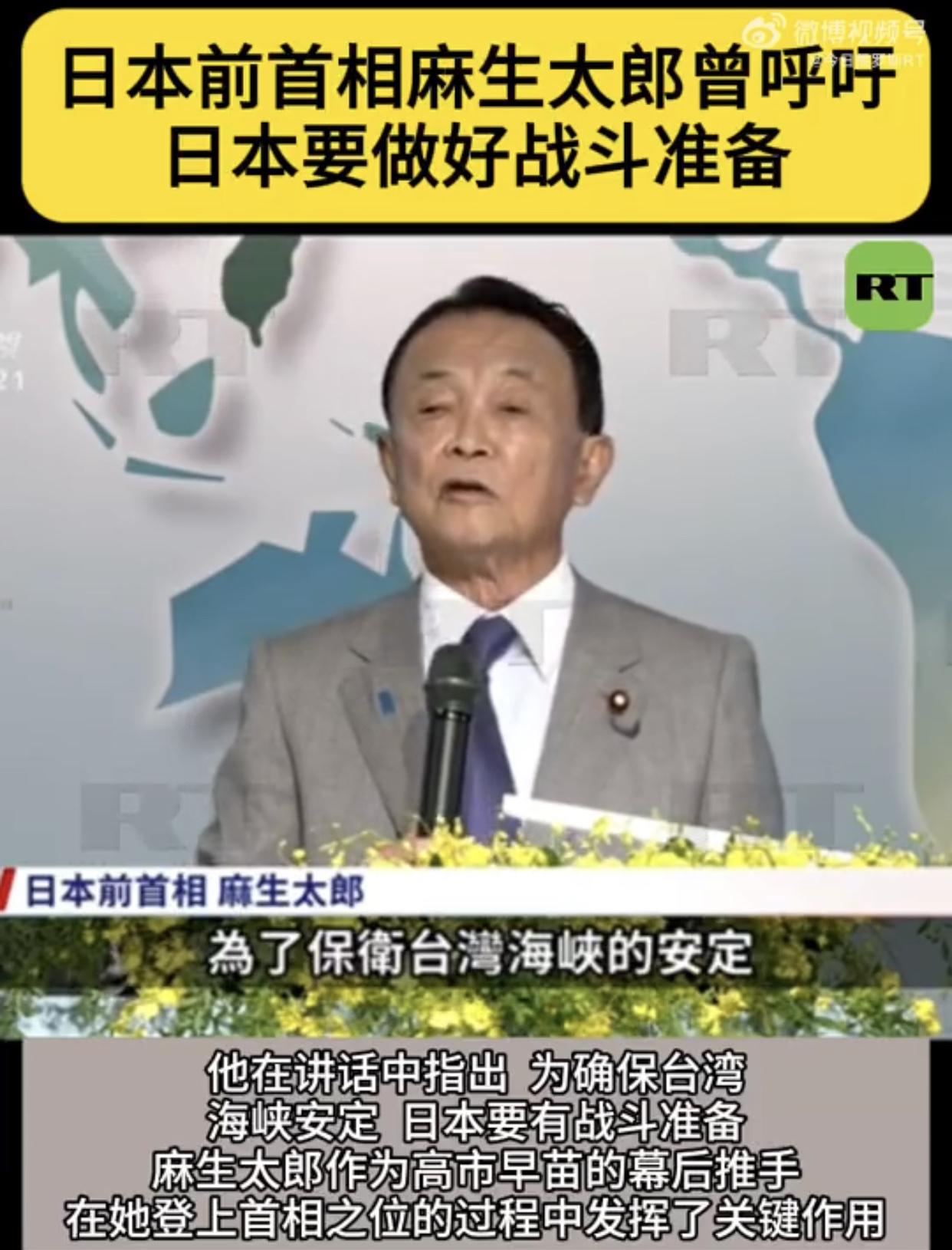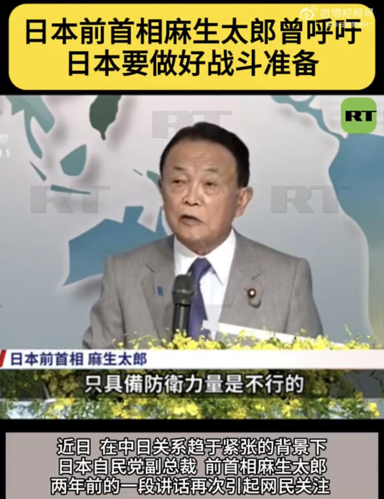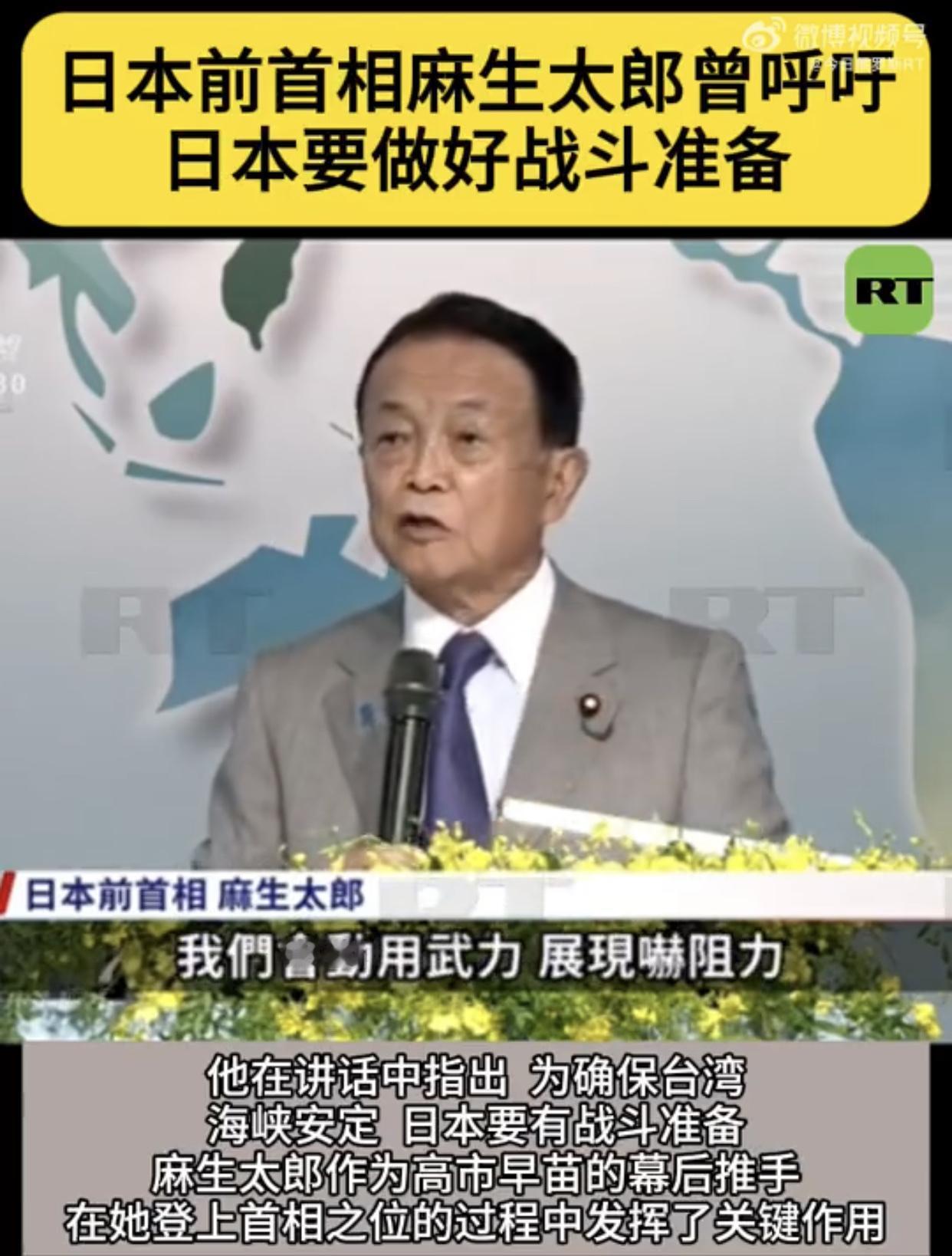 日本前首相麻生太郎表示:日本必须要有准备战斗的心理准备,日本只具备防卫能力是不行的,为了保卫台湾,为了保卫台湾海峡的安定,日本必须明确地让对手知道,日本是会动用武力的,日本要展现威慑力! 以麻生太郎为代表的日本人如果太过于高估自己,妄图以武力介入台海问题,那会变成“日本有事就是日本有事” ,从而将日本本土卷入到战争的漩涡中来,这是日本的自我毁灭之举!