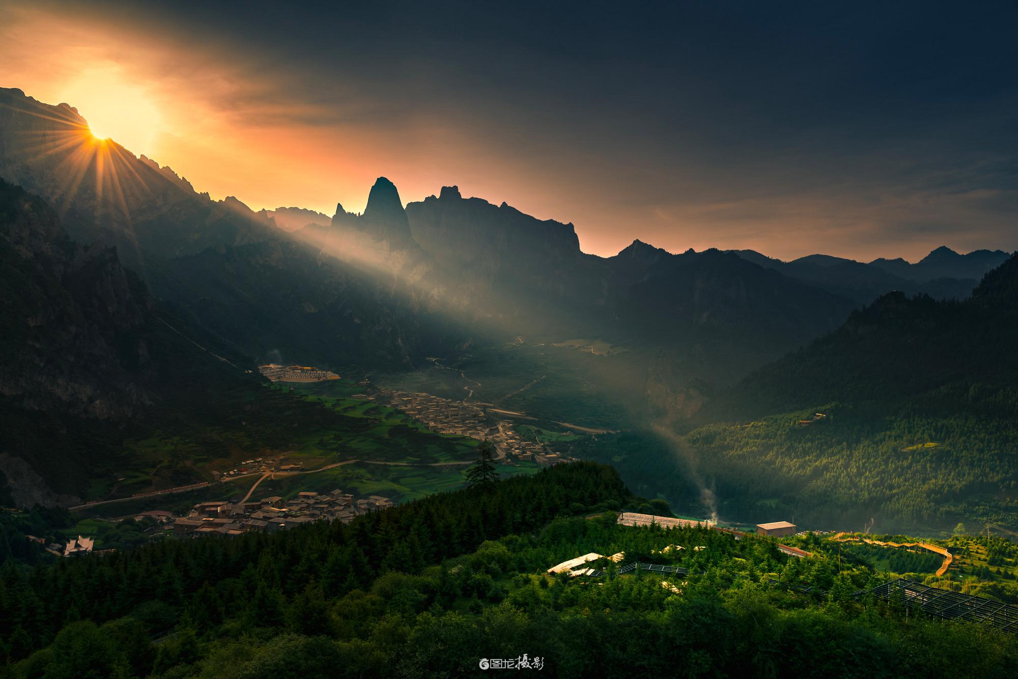 扎尕那的光瀑。当太阳在扎尕那的山巅劈开一道金缝,光瀑如神的手指,在山谷...