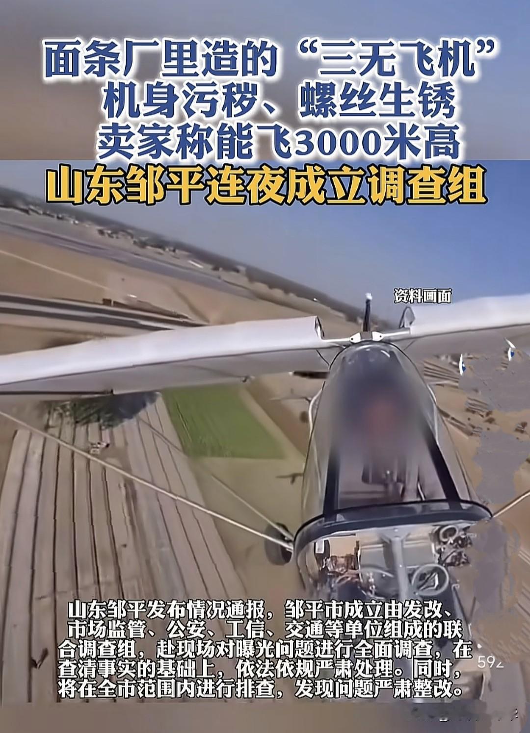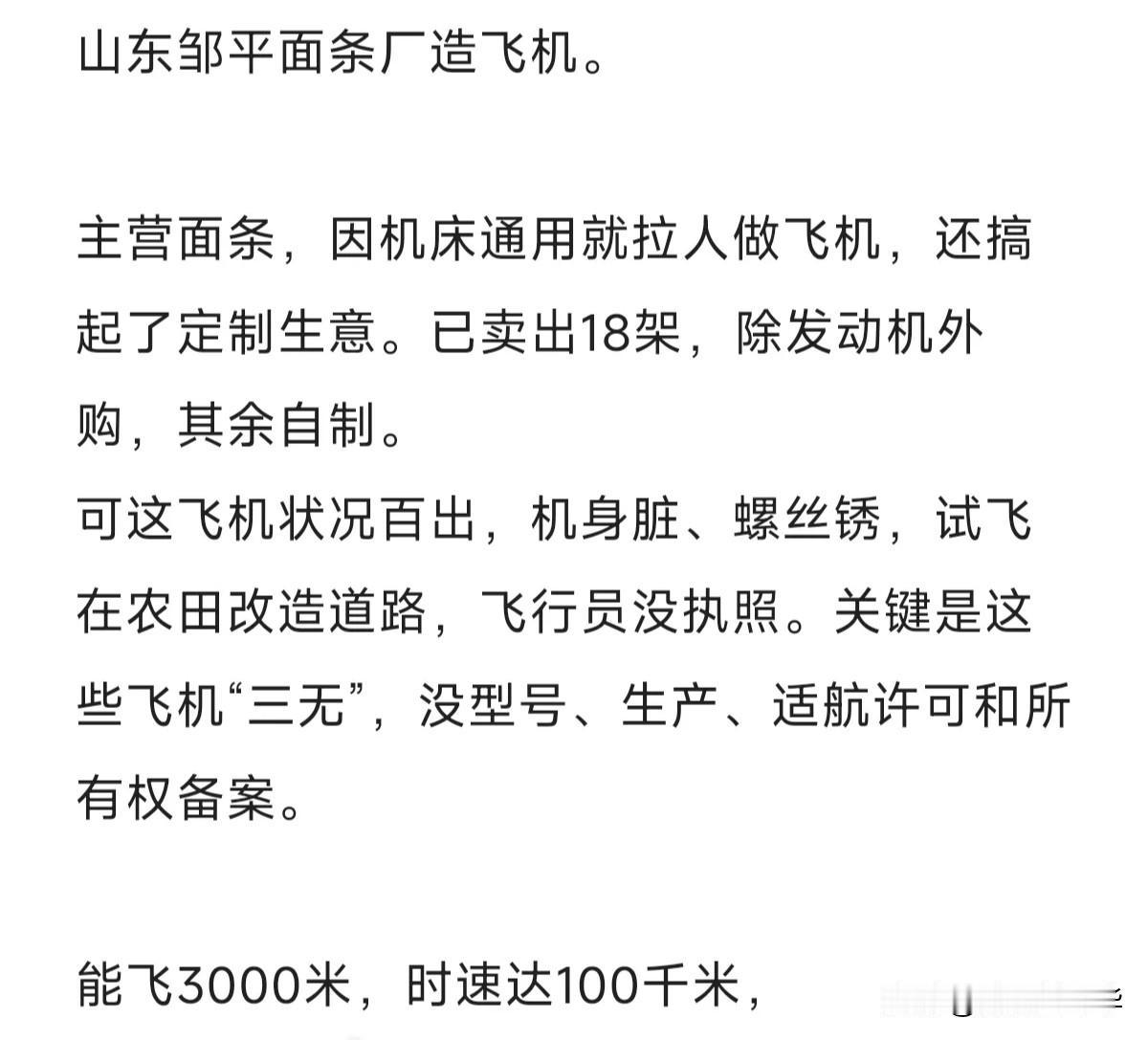 超短距离旱地拔葱起飞,升限三千,时速一百,起降场地要求低,在田间地头都可以完成。这是山东滨州一家面条厂手搓出来的飞机性能,除了发动机,剩余部件全部自己手搓,售价八万还有利润,这打了多少飞机厂和专家的脸。因机身脏,螺栓生锈,飞行员没有执照,厂家更没有生产许可,当地已连夜成立联合调查组。