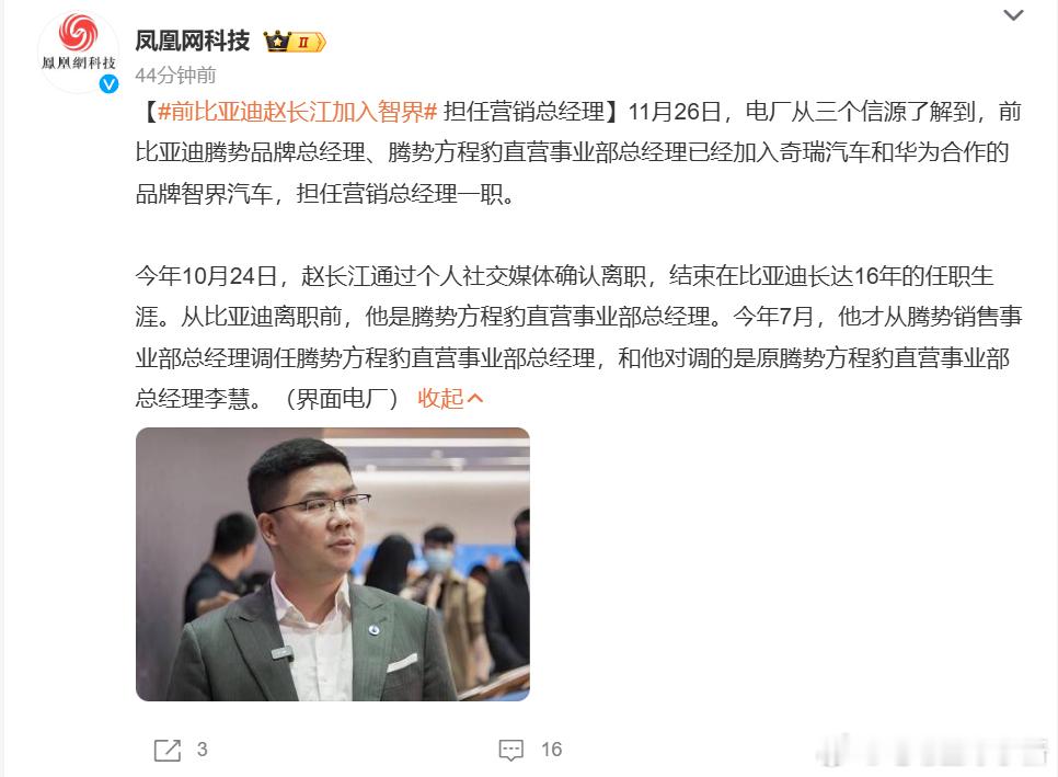 之前就有消息传出来说赵总会去智界,大概率负责营销不知道后续会不会有官方消息,等等看前比亚迪赵长江加入智界前比亚迪腾势负责人赵长江加入智界